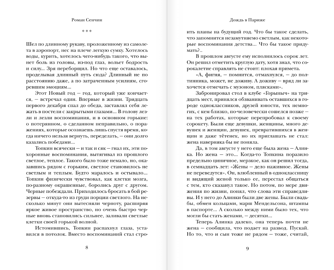 Romāns Senčins ir prozaiķis, romānu "Eltīševi", "Plūdu zona", īsās prozas krājumu un publicistikas autors. "Lielās grāmatas", "Jasnaja Poļana" balvu laureāts, "Krievu grāmatnieka" un "Nacionālā bestsellera" finālists. Jaunā romāna "Lietus Parīzē" galvenais varonis Andrejs Topkins, nonācis Parīzē, pilsētā, kas, kā viņam šķiet, var izvilkt viņu no neveiksmju un personīgo satricinājumu jūgas, gandrīz neiziet no viesnīcas un nododas pārdomām, ritinot atmiņās savu dzīvi. Viņa jaunība deviņdesmitajos gados, pirmā mīlestība un vispār - viss pirmo reizi - Tuvas galvaspilsētā Kizilā. Viņa vecāki un draugi jau ir pametuši pilsētu, bet šīs ir viņa mājas, viņš negrib aizbraukt - vispirms no inerces, pēc tam no dīvainas sajūtas: viņam šeit jādzīvo..... Un Parīzē līst lietus.