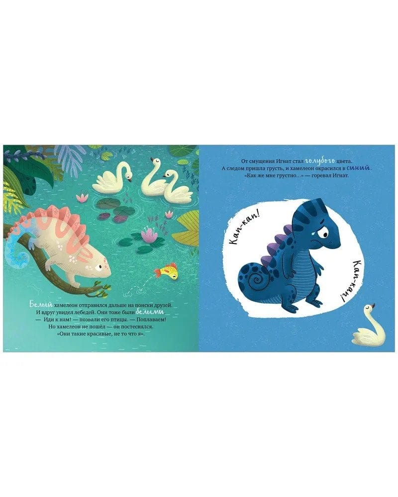 Hameleons Ignats ir apburošs mazulis, kurš maina krāsu atkarībā no sava garastāvokļa. Viņš nav tāds kā visi pārējie, un citi dzīvnieki viņu bieži vien nesaprot. Kopā ar mazo lasītāju Ignats mācīsies tikt galā ar savām emocijām un atrast draugus. Pēc Ignata piemēra bērns viegli iemācīsies atšķirt un nosaukt savas jūtas: dusmas, aizvainojumu, prieku, skaudību, kautrību, skumjas, kaunu un bailes. Un grāmatas beigās ir noderīgi padomi, kas palīdzēs ātri tikt galā ar emocijām, kad tās uzliesmo.