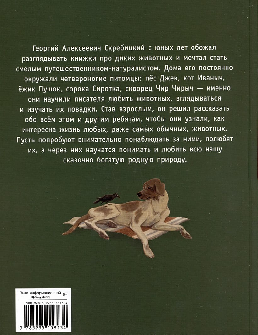Georgijs Aleksejevičs Skrebickis jau no mazotnes mīlēja aplūkot grāmatas par savvaļas dzīvniekiem un sapņoja kļūt par drosmīgu ceļotāju-dabas pētnieku. Mājās viņu nepārtraukti ieskauj četrkājainie mājdzīvnieki: suns Džeks, kaķis Ivaņičs, ezis Pušoks, sīga Sirotka, strazds Čir Čir Čirčs — tieši viņi iemācīja rakstniekam mīlēt dzīvniekus, skatīties un pētīt to paradumus. Kļūstot par pieaugušo, viņš nolēma par to visu pastāstīt arī citiem bērniem, lai viņi uzzinātu, cik interesanta ir jebkuru, pat visparastāko, dzīvnieku dzīve. Lai viņi cenšas tos uzmanīgi vērot, mīlēt un caur viņiem mācās saprast un mīlēt visu mūsu pasakaini bagāto dzimto dabu.