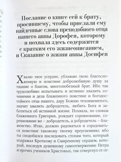 Šī sestā gadsimta askēta dvēselei labvēlīgās mācības galvenokārt būs interesantas tiem, kas nesen pievērsušies ticībai, bet arī ikvienam, kas rūpējas par savas dvēseles glābšanu. Aba Dorotejs sniedz atbildes uz dažādiem garīgās dzīves jautājumiem. Viņa mācības ir piepildītas ar dziļu gudrību, tomēr vienkāršas to pasniegšanas veidā. Ikviens viņa darbos atradīs atbildes uz sev svarīgiem jautājumiem, padomus un garīgo atbalstu, kas nepieciešams, lai kuģotu dzīves jūrā.