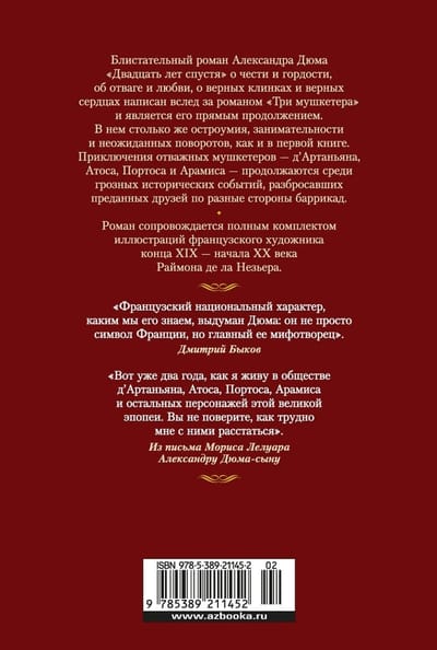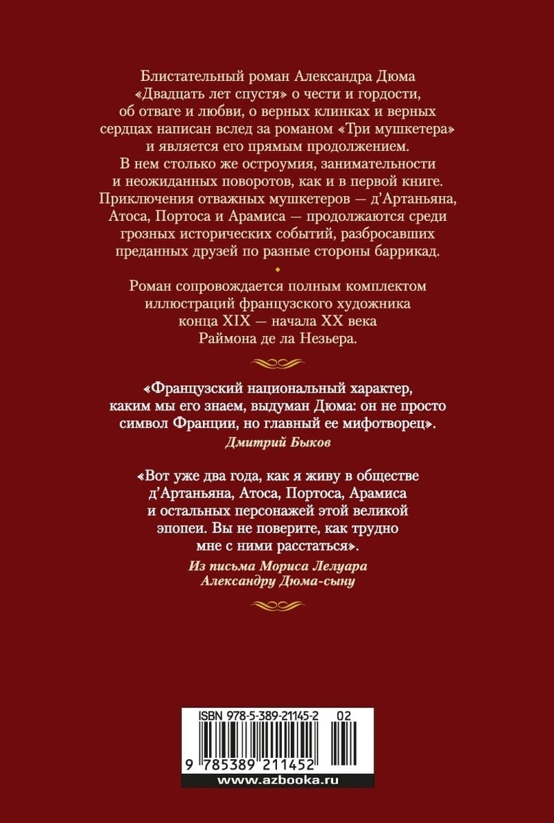 Aleksandra Dimā izcilais romāns "Divdesmit gadi vēlāk" par godu un lepnumu, drosmi un mīlestību, uzticīgiem asmeņiem un uzticīgām sirdīm tika sarakstīts pēc romāna "Trīs musketieri" un ir tā tiešs turpinājums. Tajā ir tikpat daudz asprātības, izklaides un negaidītu pavērsienu kā pirmajā grāmatā.