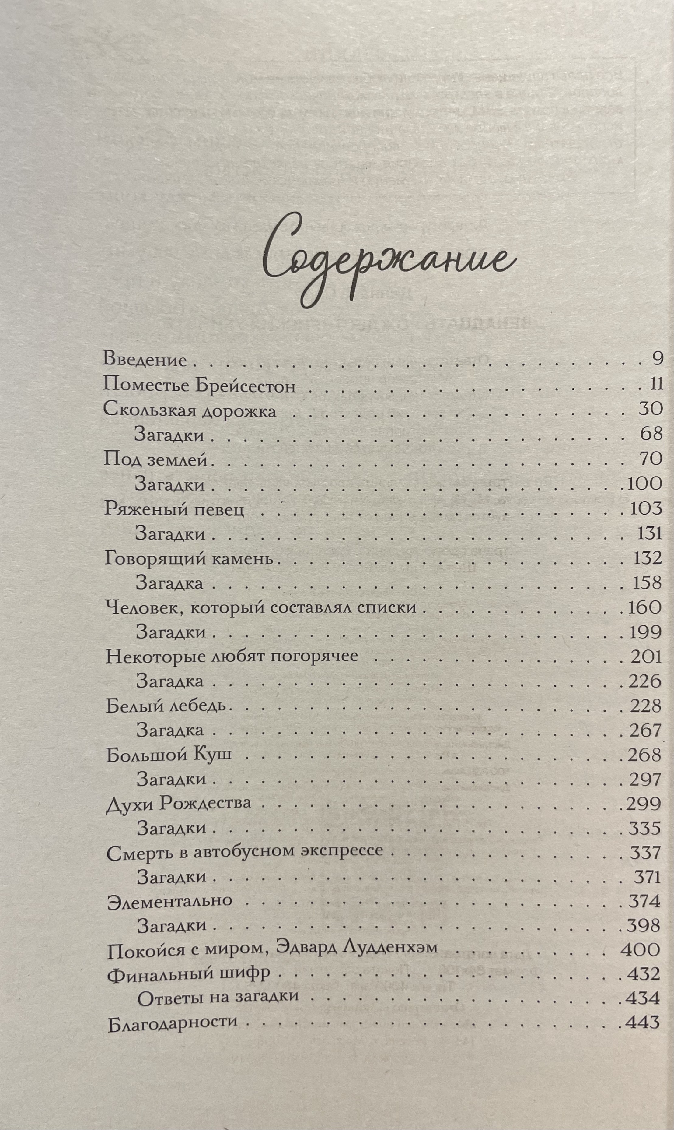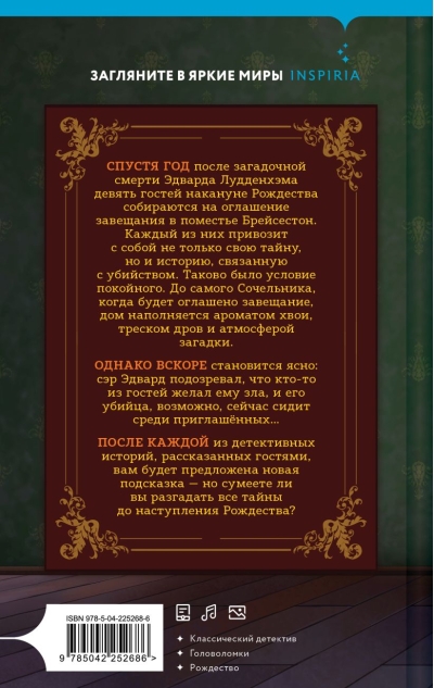 Gadu pēc Edvarda Ladenhema noslēpumainās nāves deviņi viesi Ziemassvētku vakarā pulcējas Breistonas muižā, lai nolasītu viņa testamentu. Katrs atnes ne tikai noslēpumu, bet arī stāstu, kas saistīts ar slepkavību. Tāds bija mirušā nosacījums. Līdz Ziemassvētku vakaram, kad tiek nolasīts testaments, māju piepilda priežu skuju smarža, kamīna sprakšķēšana un noslēpumainības gaisotne.