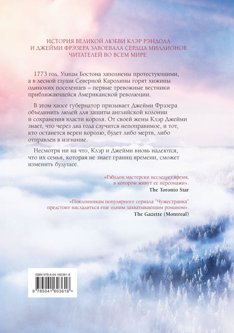 1773. Bostonas ielas ir pilnas ar protestētājiem, un Ziemeļkarolīnas mežainajā tuksnesī deg vientuļo kolonistu būdas - pirmās satraucošās pazīmes, kas liecina par tuvojošos Amerikas revolūciju. Šajā haosā gubernators mudina Džeimiju Freizeru saliedēt tautu, lai aizstāvētu angļu koloniju un saglabātu karaļa varu. No savas sievas Klēras Džeimijs zina, ka pēc diviem gadiem notiks neatgriezenisks pavērsiens, un ikviens, kurš paliks uzticīgs karalim, būs vai nu miris, vai izsūtīts trimdā. Neraugoties uz to, Klērai un Džeimijam ir atdzimusi cerība, ka viņu ģimene, kurai nav laika robežu, var mainīt nākotni.