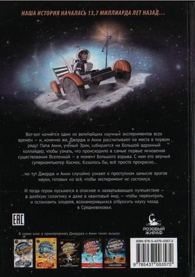 Drīz sāksies viens no visu laiku lielākajiem zinātniskajiem eksperimentiem - un, protams, Džordžs un Annija rēķinās ar vietām pirmajā rindā! Annijas tētis, zinātnieks Ēriks, dodas uz Lielo hadronu paātrinātāju, lai noskaidrotu, kas notika visuma pastāvēšanas pirmajos mirkļos - Lielā sprādziena brīdī. Viņam līdzi ir viņa uzticamais superdators Cosmos. Šķiet, ka viss ir kārtībā... ...Bet tad Džordžs un Annija nejauši uzzina par zinātnes ienaidnieku noziedzīgu sazvērestību, kuri gatavi darīt visu, lai eksperiments nenotiktu. Un tad varoņi dodas bīstamā un aizraujošā ceļojumā - uz tālu galaktiku un pat kvantu pasauli -, lai pārspētu un apturētu ļaundarus, kas plāno zinātni atmest atpakaļ viduslaikos.