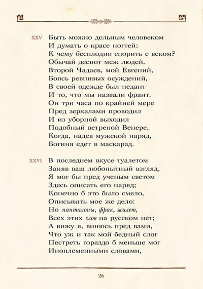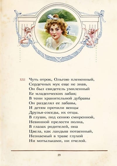 "Vai esat lasījis "Oņeginu"? Ko jūs domājat par Oņeginu? Ko jūs sakāt par "Oņeginu"? Tie ir jautājumi, kas nemitīgi atkārtojas rakstnieku un krievu lasītāju lokā," - pēc romāna otrās nodaļas publicēšanas sacīja rakstnieks, uzņēmīgs izdevējs un, starp citu, daudzu epigrammu varonis Puškins Tadejs Bulgarins. Ilgu laiku "Jevgeņijs Oņegins" nav pieņemts vērtēt. Tā paša Bulgarina vārdiem sakot, tas ir "uzrakstīts Puškina dzejā. Ar to pietiek." Taču ilustratori joprojām priecē lasītājus ar dažādām mākslinieciskām interpretācijām par romānu dzejā. Vienu no pirmajiem zīmējumu cikliem "Jevgeņijam Oņeginam" radīja Pāvels Sokolovs, kuru laikabiedri dēvēja par "Tatjanas radītāju". Pusgadsimtu vēlāk lielu popularitāti guva krāšņs izdevums, ko izdeva viens no labākajiem Krievijas tipogrāfiem - R. Golikes un A. Vilborga partnerība, imperatora galma piegādātājs, ar Jeļenas Samokišas-Sudkovskas akvareļiem.