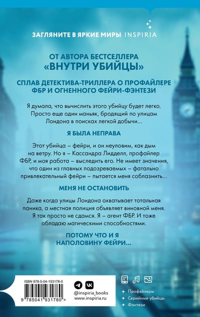 Es domāju, ka noskaidrot šo slepkavu būs viegli. Tikai kārtējais maniaks, kas klīst pa Londonas ielām, meklējot vieglu upuri... Es kļūdījos. Šis slepkava ir feju ģints, un viņš ir tikpat netverams kā dūmi vējā. Bet es esmu Kasandra Liddela, FIB profilētāja, un mans uzdevums ir viņu izsekot. Nav svarīgi, ka viens no galvenajiem aizdomās turamajiem - nāvējoši pievilcīga fae - cenšas mani savaldzināt... Es esmu neapturams. Pat tad, kad Londonas ielās valda pilnīga panika un vietējā policija pasludina mani par vainīgu. Es tik viegli nepadošos. Es esmu FIB aģente. Un man ir arī maģiskas spējas. Tas tāpēc, ka es esmu pusfareja.