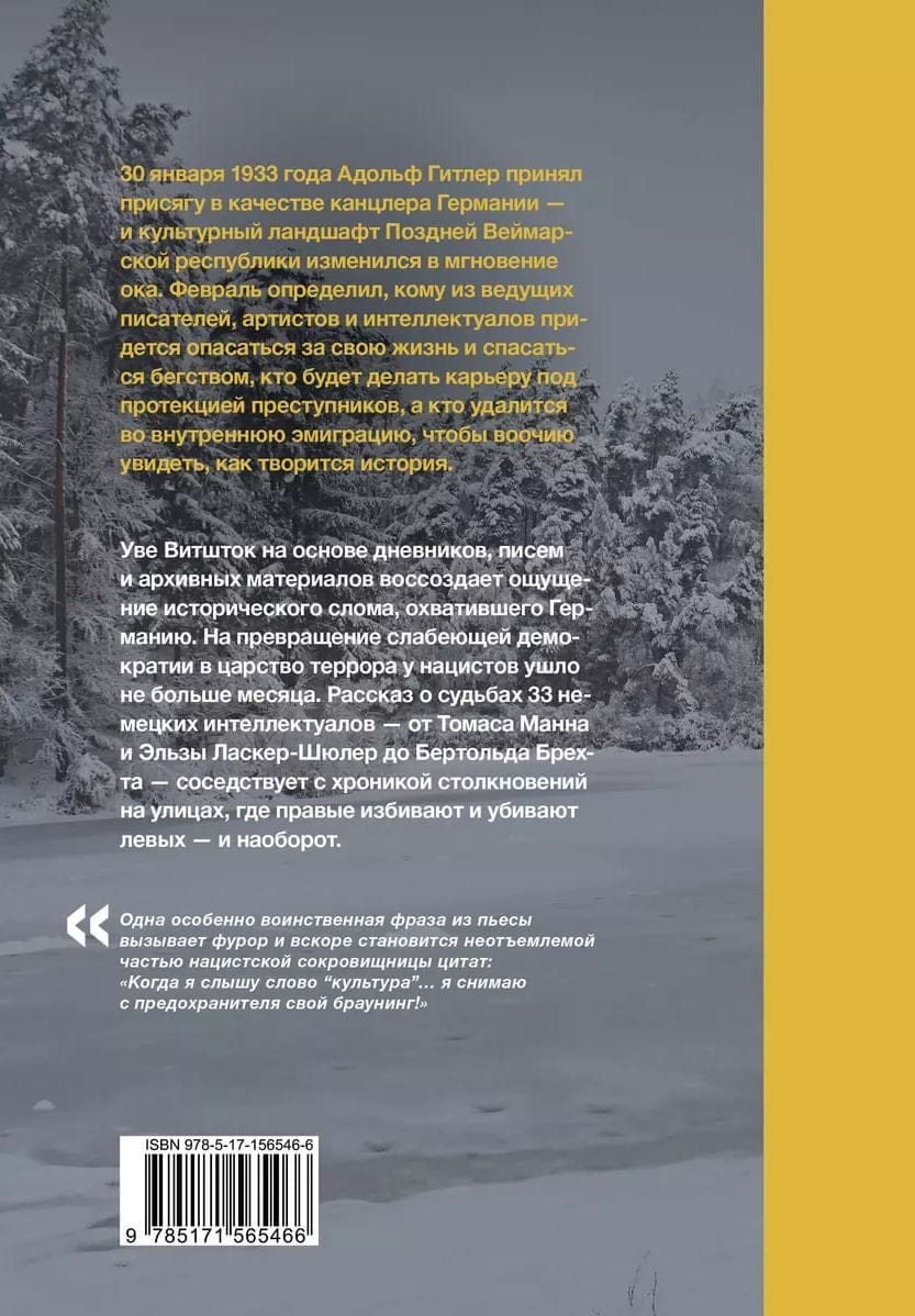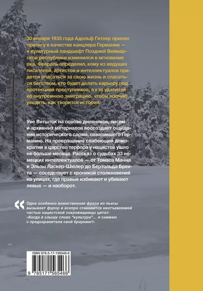 1933. gada 30. janvārī Ādolfs Hitlers tika zvērināts kā Vācijas kanclers, un vēlās Veimāras republikas kultūrainava mainījās acs mirkšķinājumā. Februāris noteica, kuram no vadošajiem rakstniekiem, māksliniekiem un intelektuāļiem būs jābaidās par savu dzīvību un bēgt, kurš turpinās karjeru noziedznieku aizsardzībā un kurš dosies uz iekšējo emigrāciju, lai redzētu, kā top vēsture.