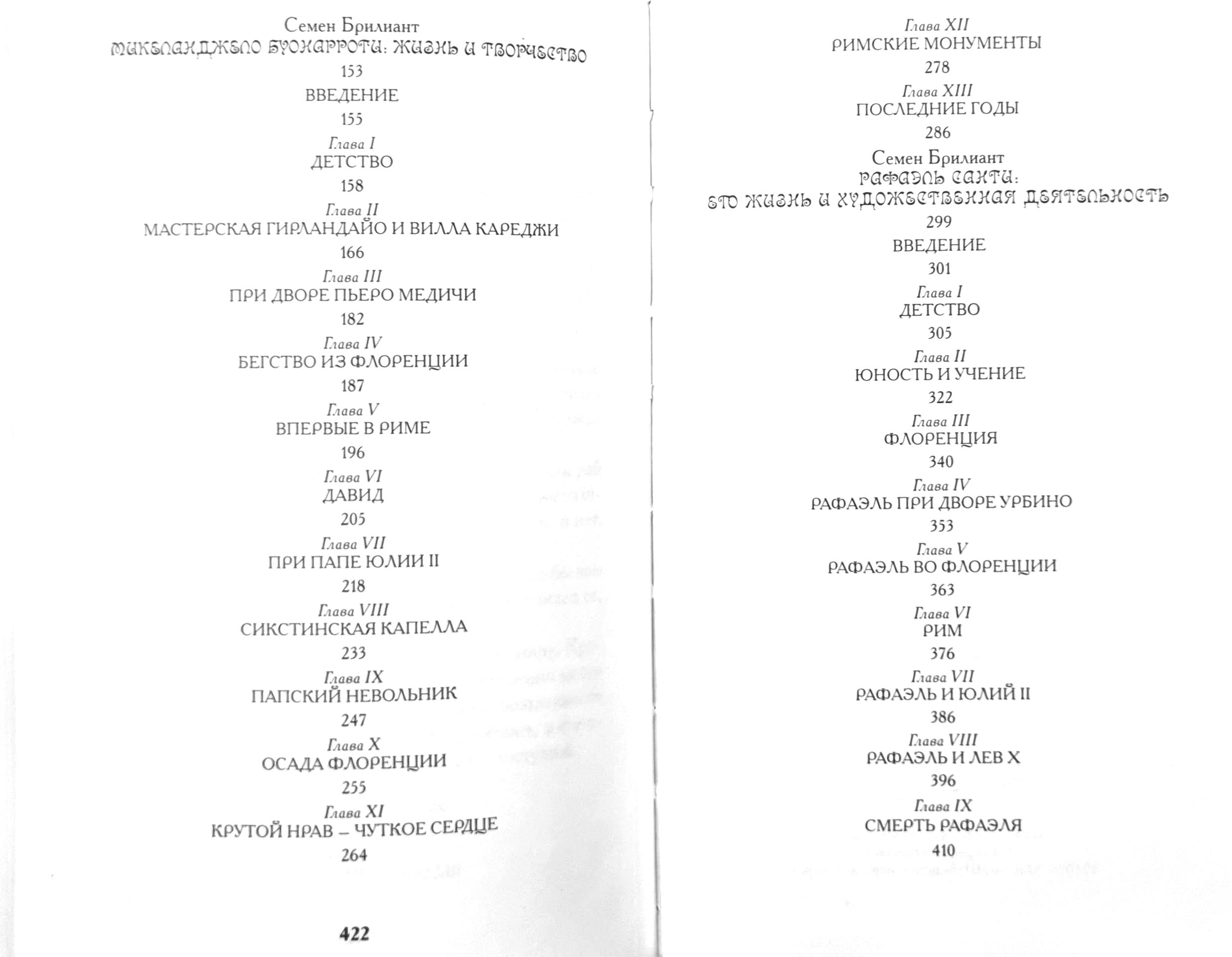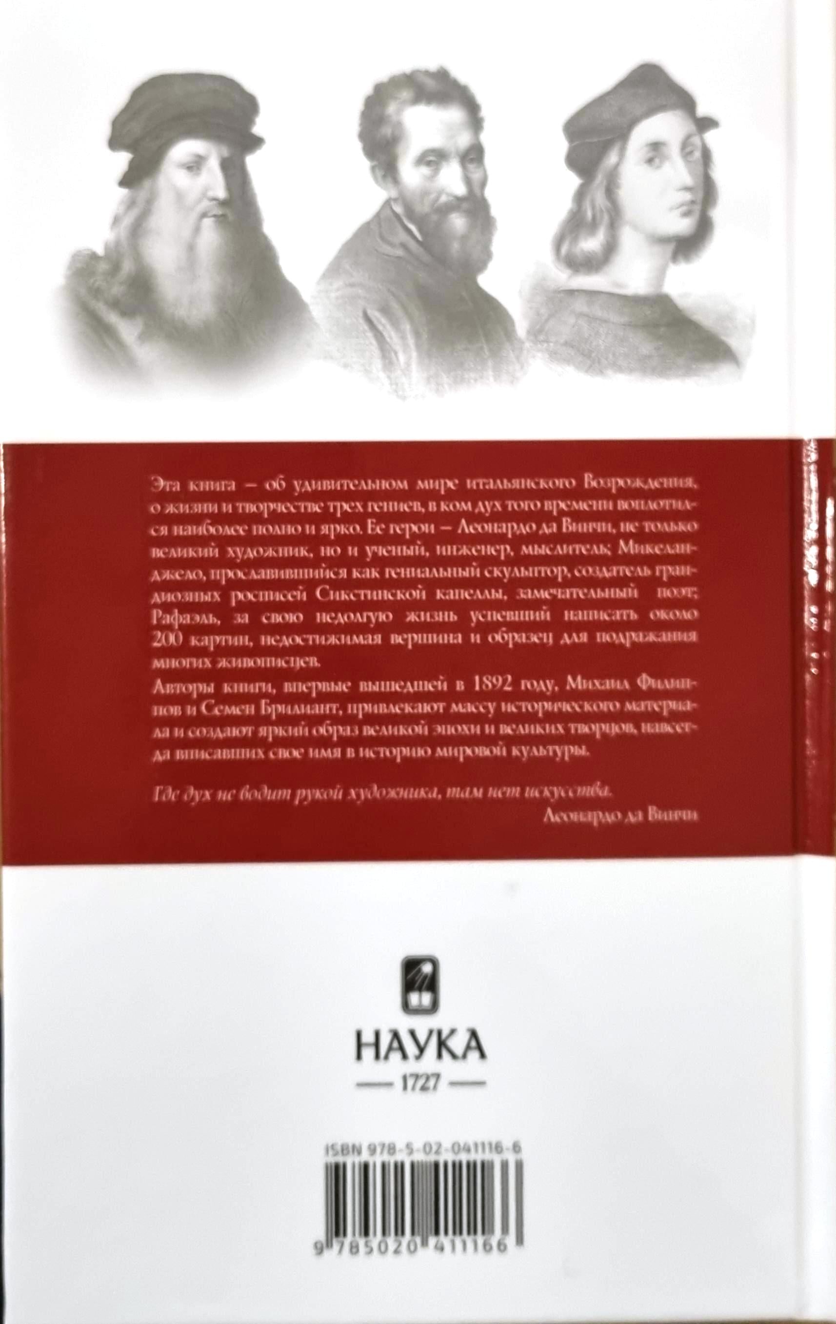 Grāmatas autori M. M. Filippovs un S. M. Brilliants pieejamā un aizraujošā formā runā par trīs itāļu renesanses lielmeistaru - Leonardo da Vinči, Rafaēla un Mikelandželo dzīvi un darbu. Pirmoreiz izdevis Pēterburgas izdevējs F.F. Pavļenkovs XIX gadsimta beigās, kolekcija kļuva par īstu krievu žurnālistikas klasiku.