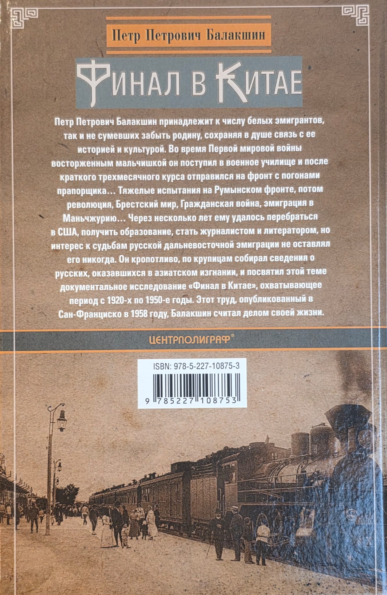 Pjotrs Petrovičs Balakšins ir viens no tiem baltajiem emigrantiem, kas nekad neaizmirsa savu dzimteni, saglabājot ciešu saikni ar tās vēsturi un kultūru. Pirmā pasaules kara laikā, būdams entuziastisks zēns, viņš iestājās militārajā akadēmijā un pēc īsiem trīs mēnešu kursiem devās uz fronti praporščika pakāpē. Viņš izturēja grūtus pārbaudījumus Rumānijas frontē, pēc tam revolūciju, Brestļitovskas mierlīgumu, Pilsoņu karu un emigrāciju uz Mandžūriju. Pēc dažiem gadiem viņam izdevās pārcelties uz ASV, iegūt izglītību un kļūt par žurnālistu un rakstnieku, taču viņa interese par krievu emigrantu likteņiem Tālajos Austrumos nekad nemazinājās. Viņš rūpīgi, pamazām, vāca informāciju par krieviem Āzijas trimdā un veltīja šai tēmai savu dokumentālo pētījumu "Fināls Ķīnā", aptverot laika posmu no 20. gadsimta 20. līdz 50. gadiem. Balakšins šo 1958. gadā Sanfrancisko publicēto darbu uzskatīja par sava mūža darbu.