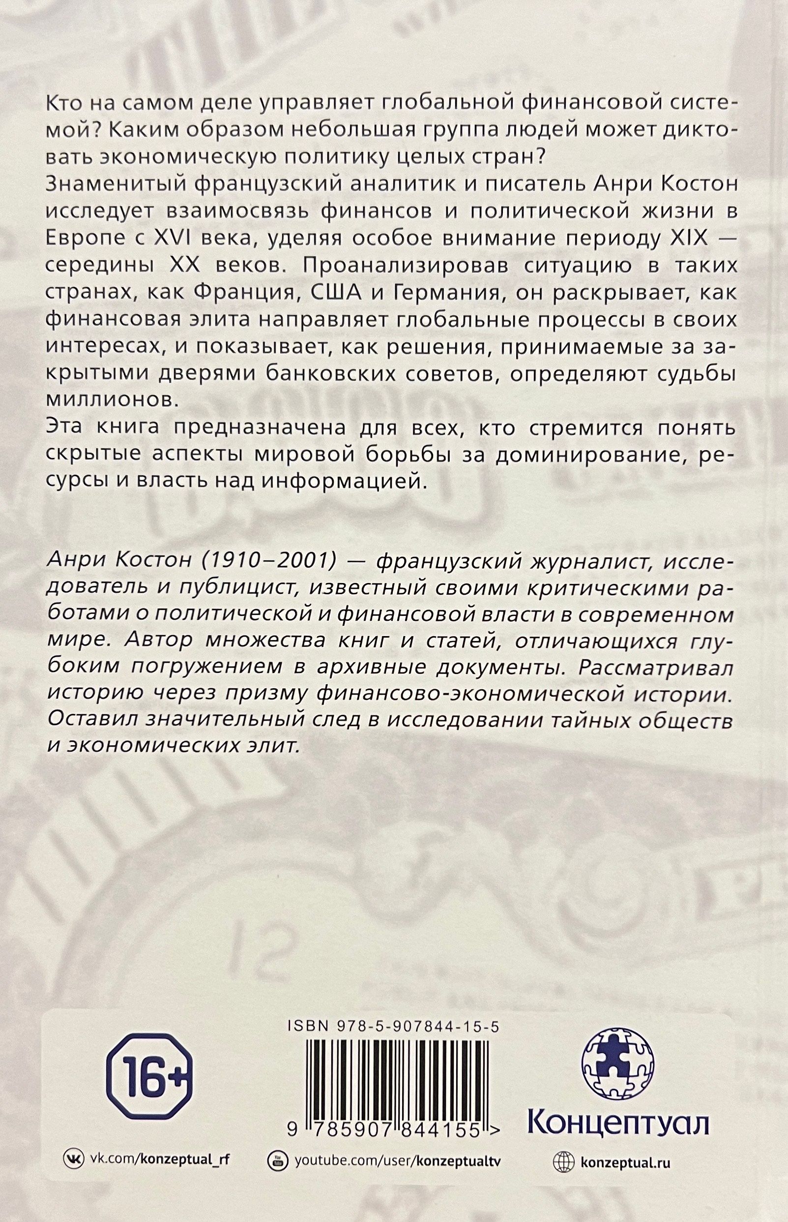 Kas patiesībā pārvalda globālo finanšu sistēmu? Kā neliela cilvēku grupa var diktēt veselu valstu ekonomikas politiku? Pazīstamais franču analītiķis un autors Anrī Kostons pēta attiecības starp finansēm un politisko dzīvi Eiropā kopš XVI gadsimta, īpašu uzmanību pievēršot XIX gadsimtam līdz XX gadsimta vidum. Analizējot situāciju tādās valstīs kā Francija, Amerikas Savienotās Valstis un Vācija, viņš atklāj, kā finanšu elite virza globālos procesus savās interesēs, un parāda, kā aiz slēgtām banku valžu durvīm pieņemtie lēmumi nosaka miljoniem cilvēku likteņus. Šī grāmata ir domāta ikvienam, kas vēlas izprast globālās cīņas par dominanci, resursiem un varu pār informāciju slēptos aspektus.