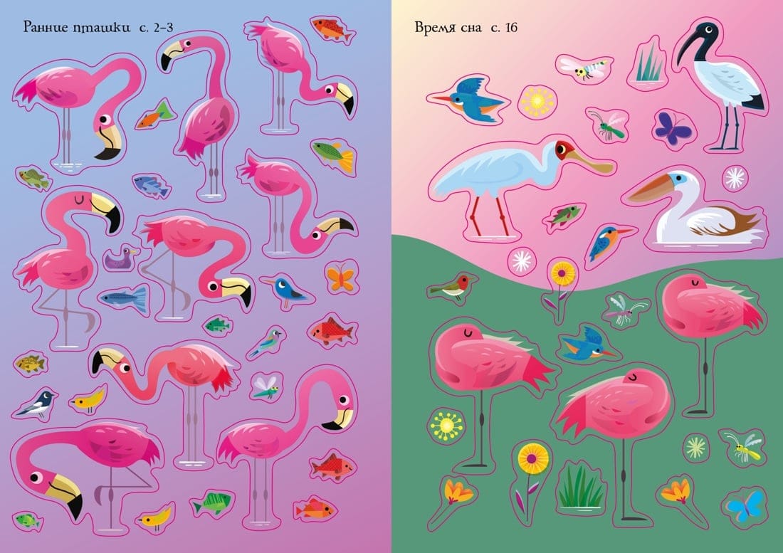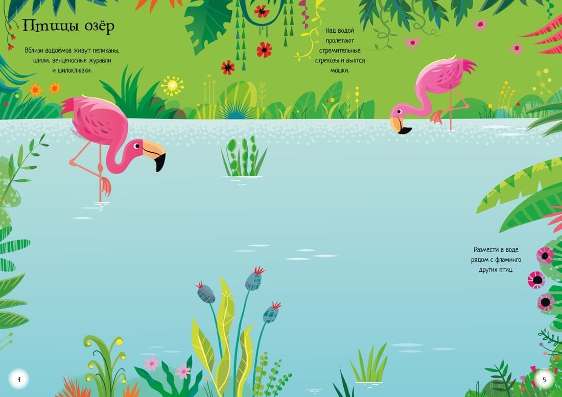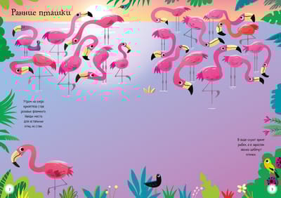Ezerā dzīvo rozā flamingo. Skatiet, kā paiet viņu diena, un tajā pašā laikā iepazīstieties ar citiem putniem, kas dzīvo uz ūdens: dzērves, gārņus, avoketes un pelikānus.