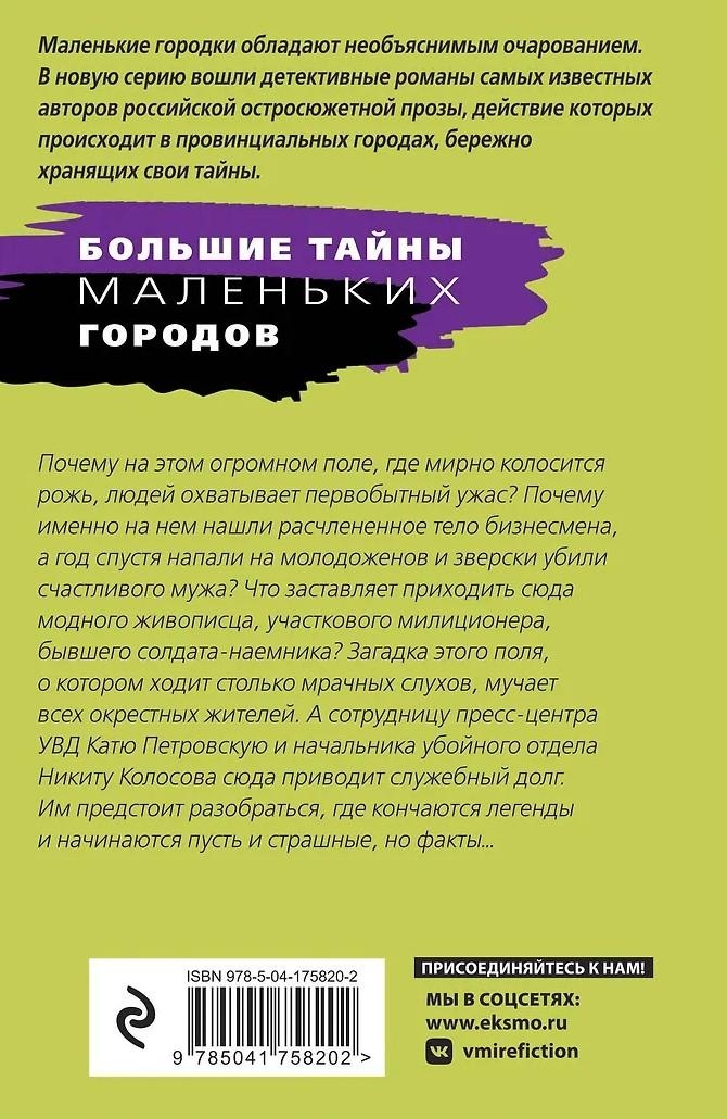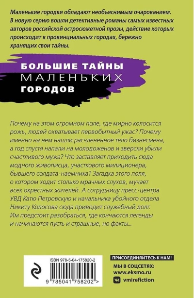 Kāpēc šis plašais lauks, kur mierīgi aug rudzi, pārņem cilvēkus ar pirmatnējām bailēm? Kāpēc šeit tika atrasts uzņēmēja sakropļots līķis, un gadu vēlāk uzbruka jaunlaulātajam pārim, bet laimīgais vīrs tika nežēlīgi nogalināts? Kas pamudina modes mākslinieku, vietējo policistu un bijušo algotni ierasties šeit? Šī lauka noslēpums, par kuru klīst tik daudz tumšu baumu, moka visus vietējos iedzīvotājus. Un pienākumu dēļ šeit ierodas Katja Petrovskaja, Iekšlietu direkcijas Preses centra darbiniece, un Ņikita Kolosovs, slepkavību izmeklēšanas nodaļas vadītājs. Viņiem jānoskaidro, kur beidzas leģendas un sākas fakti, kaut arī biedējoši...