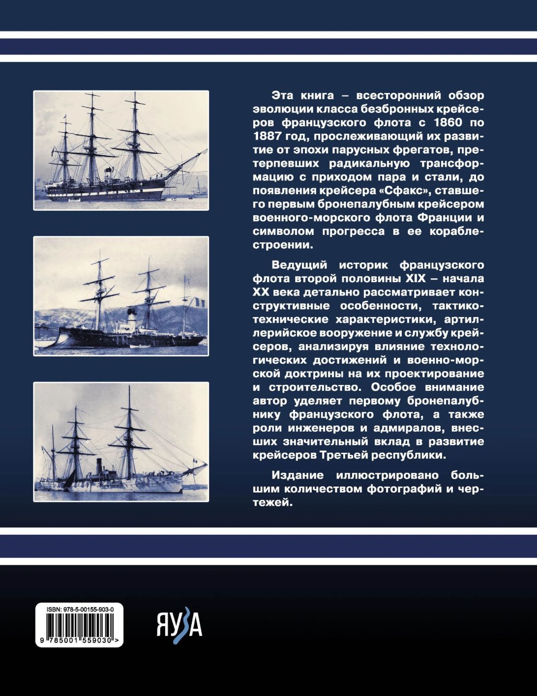 Šī grāmata ir visaptverošs pārskats par Francijas Jūras spēku nebruņoto kreiseru evolūciju no 1860. līdz 1887. gadam, izsekojot to attīstībai no buru fregašu laikmeta, ko radikāli pārveidoja tvaiks un tērauds, līdz kreisera Sfax parādīšanās brīdim — pirmajam bruņotajam kreiserim Francijas Jūras spēkos un kuģubūves progresa simbolam. Vadošais Francijas Jūras spēku vēsturnieks no 19. gadsimta otrās puses un 20. gadsimta sākuma detalizēti aplūko kreiseru konstrukcijas iezīmes, veiktspējas raksturlielumus, artilēriju un dienestu, analizējot tehnoloģisko sasniegumu un jūras spēku doktrīnas ietekmi uz to projektēšanu un konstrukciju. Autors īpašu uzmanību velta Francijas Jūras spēku pirmajam bruņotajam kreiserim, kā arī inženieru un admirāļu lomai, kuri deva nozīmīgu ieguldījumu kreiseru attīstībā Trešās republikas laikā. Publikācija ir ilustrēta ar daudzām fotogrāfijām un zīmējumiem.