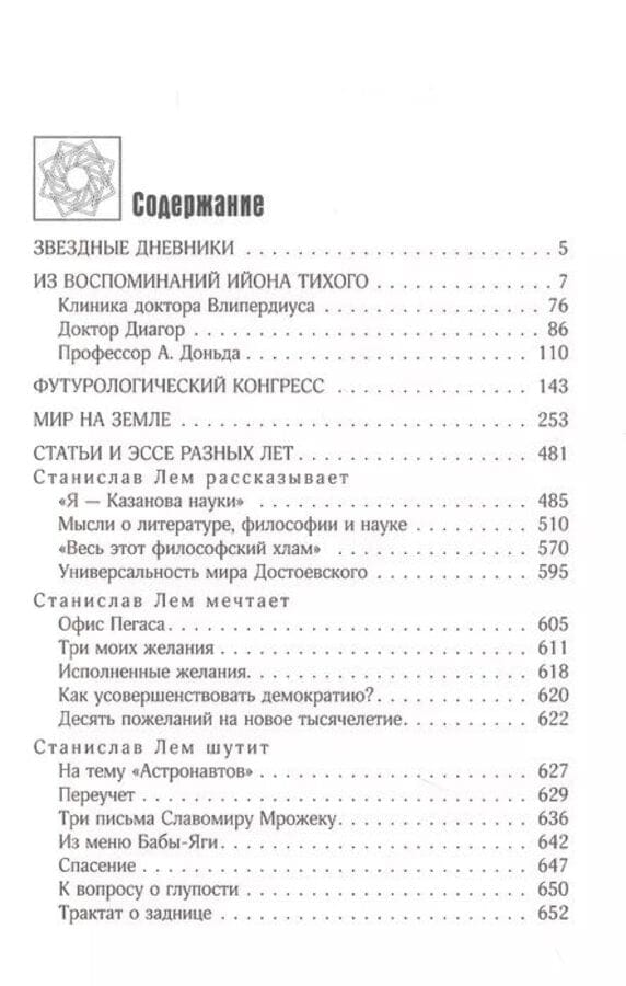 Šajā Staņislava Lema apkopoto darbu sējumā iekļautas "Zvaigžņu dienasgrāmatas" un "Atmiņas" par Jonu Kluso nākamās lappuses: "Miers uz zemes", "Futuroloģiskais kongress" un atsevišķi stāsti, kā arī intervijas un esejas par dažādām tēmām - no politikas līdz kanibālismam, no Dostojevska daiļrades vērtējuma līdz argumentiem par cilvēka muļķību.