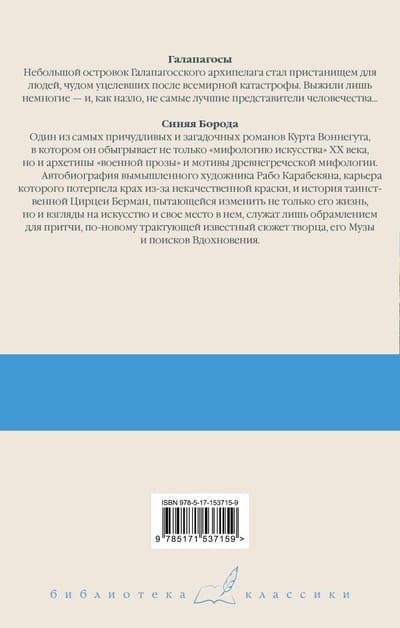 Kurts Vonneguts ir XX gadsimta literatūras ikona. Viņš ir amerikāņu rakstnieks, satīriķis, žurnālists un mākslinieks, kura acīm redzēts gandrīz viss divdesmitais gadsimts. Pasaulslaveno romānu "Kaķa šūpulis" un "Kautuve piecas" autors. Vonneguta radošajā stilā apvienojas kodīga satīra, filozofija, daiļliteratūra, groteska un melnais humors. Galapagu salas: Galapagu arhipelāga neliela sala ir kļuvusi par patvērumu cilvēkiem, kas brīnumainā kārtā izdzīvojuši pasaules mēroga katastrofā. Izdzīvojuši tikai daži - un, kā jau tas laimējas, ne labākie cilvēces pārstāvji... Zilā bārda: Viens no Kurta Vonneguta dīvainākajiem un noslēpumainākajiem romāniem, kurā viņš apspēlē ne tikai divdesmitā gadsimta "mākslas mitoloģiju", bet arī "militārās prozas" arhetipus un grieķu mitoloģijas motīvus. Fiktīvā mākslinieka Rabo Karabekiana, kura karjeru sagrāva nekvalitatīvas krāsas, autobiogrāfija un stāsts par noslēpumaino Circeju Bermanu, kas cenšas mainīt ne tikai viņa dzīvi, bet arī uzskatus par mākslu un savu vietu tajā, kalpo tikai kā ietvars līdzībai, reinterpretējot labi zināmo stāstu par radītāju, viņa Mūzu un iedvesmas meklējumiem.