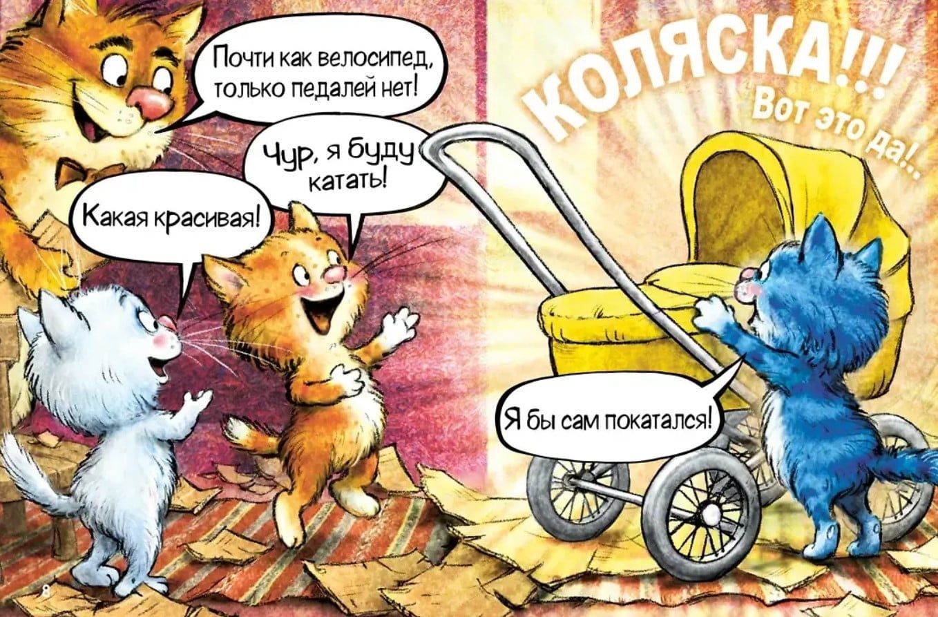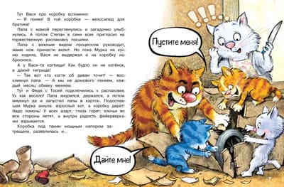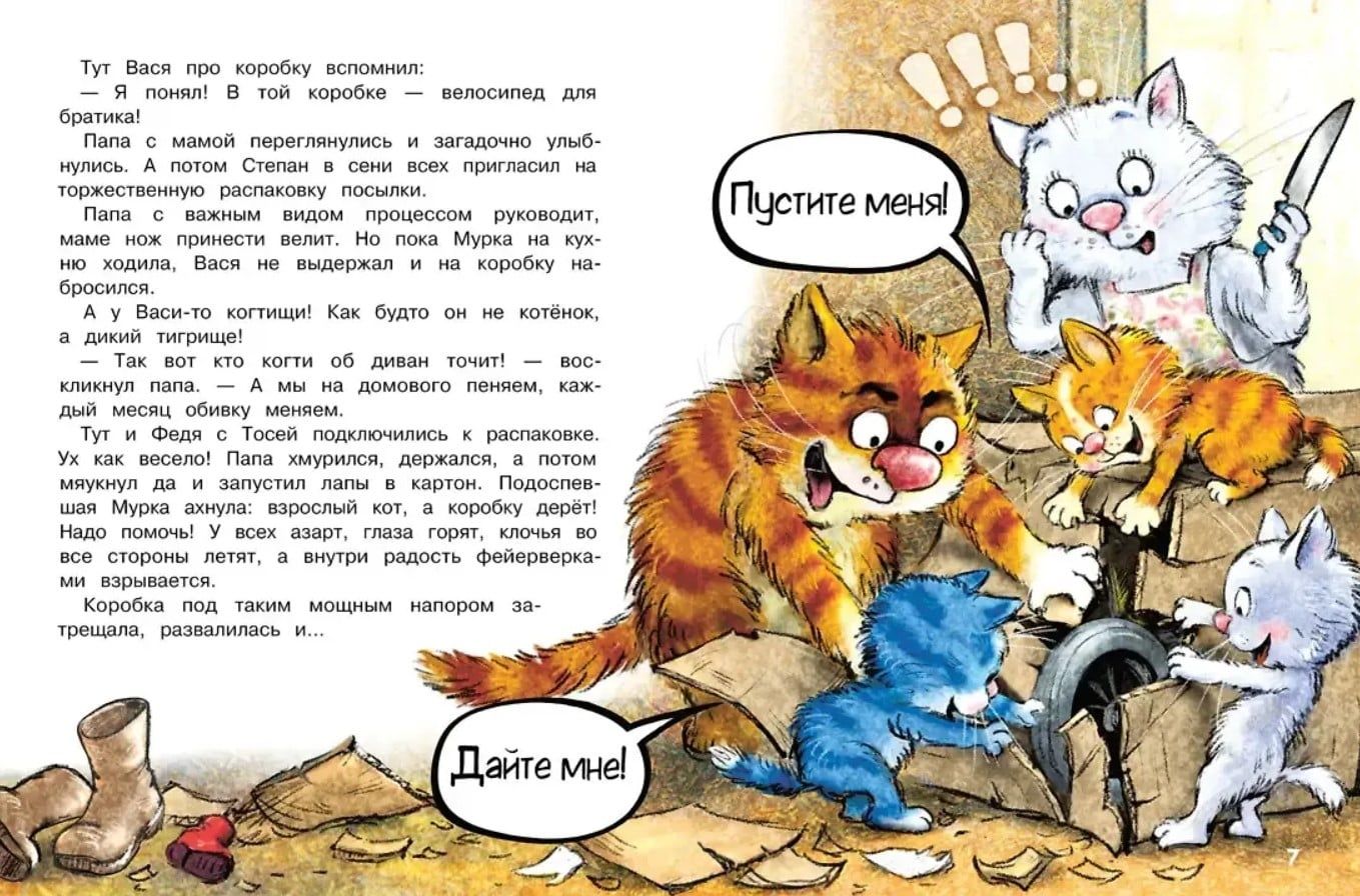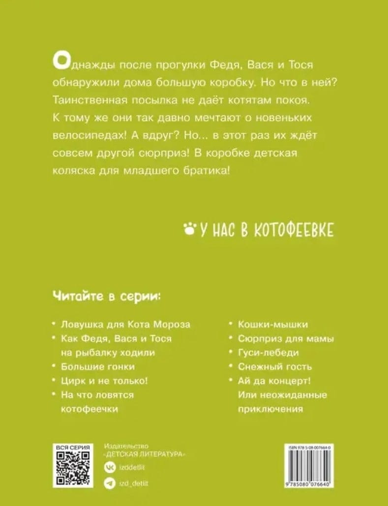 Kādu dienu pēc pastaigas Fedja, Vasja un Tosja mājās atrada lielu kasti. Bet kas tajā ir? Noslēpumaina paciņa vajā kaķēnus. Turklāt viņi tik ilgi sapņojuši par jauniem velosipēdiem! Kas būtu, ja? Bet... šoreiz viņus sagaida pavisam cits pārsteigums. Kastē ir ratiņi viņu mazajam brālim!