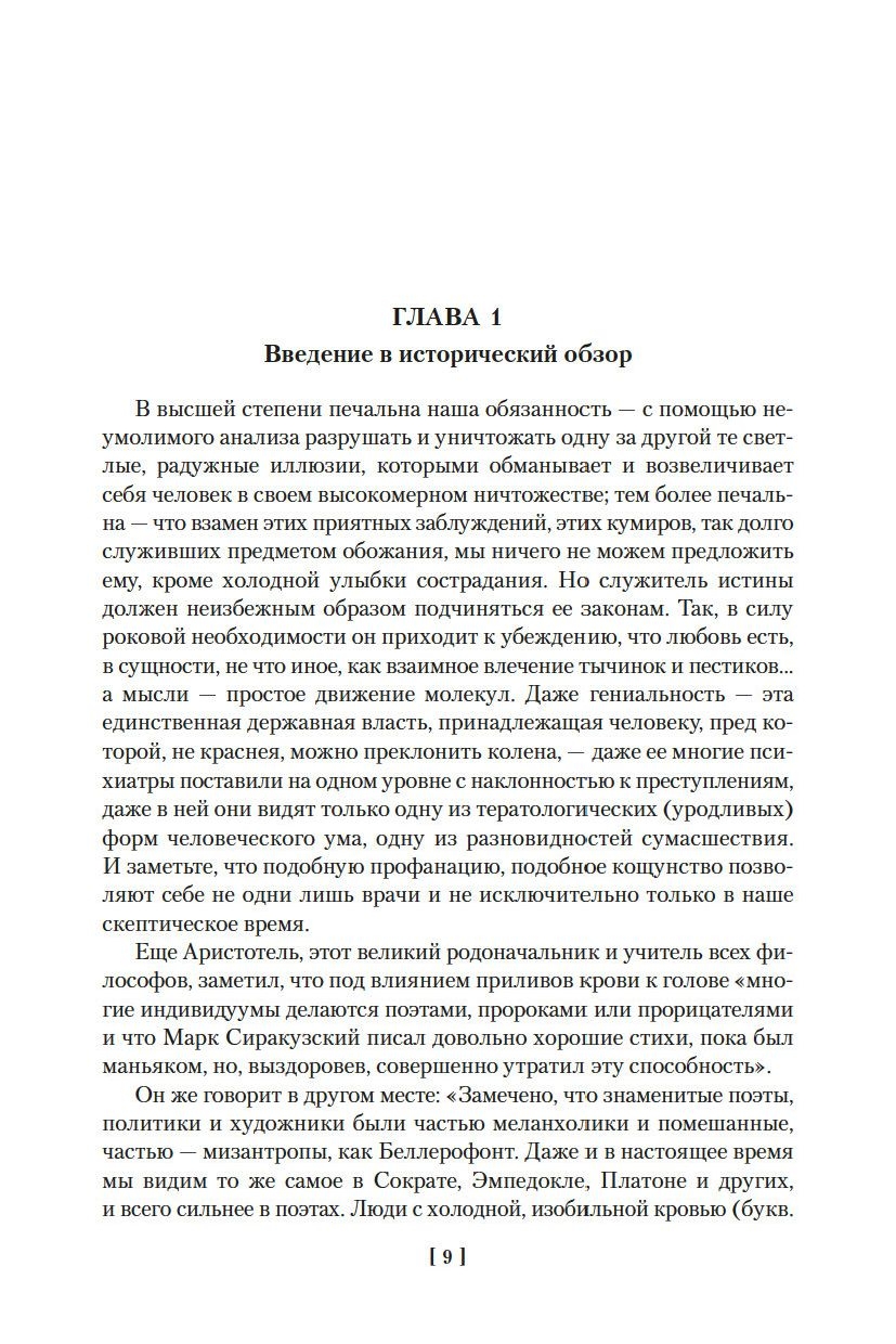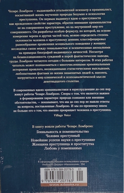 Čezāre Lombroso bija ievērojams itāļu psihiatrs un kriminālists, kurš savu dzīvi veltīja neprāta un noziedznieku psiholoģijas izpētei. Viņš bija pirmais, kurš izvirzīja ideju par noziedzību kā iedzimtu īpašību, pievēršot kriminālistu uzmanību nevis izdarītajam noziegumam, bet gan noziedznieka iekšējai pasaulei. Viņš izstrādāja īpašu formulu, pēc kuras, pamatojoties uz galvaskausa un citu ķermeņa daļu mērījumiem, var noteikt cilvēka noslieces pakāpi uz noziedzīgu nodarījumu, klasificēja dažādas antisociālas uzvedības izpausmes sievietēm, uz ievērojamu personību biogrāfiju piemēriem pētīja ģenialitātes un garīgo anomāliju saistību. Neraugoties uz nepievilcīgajiem spriedumiem un dažkārt fantastiskajiem secinājumiem, Lombroso darbi mūsdienās tiek lasīti ar lielu interesi. Šajos darbos lasītājs var iepazīties ar daudziem pagātnes krimināliem stāstiem, negaidītiem statistiskiem aprēķiniem, kurioziem faktiem no slavenu cilvēku dzīves un, visbeidzot, iegrimt 19. gadsimta klīniskās un psihoanalītiskās domas pasaulē.