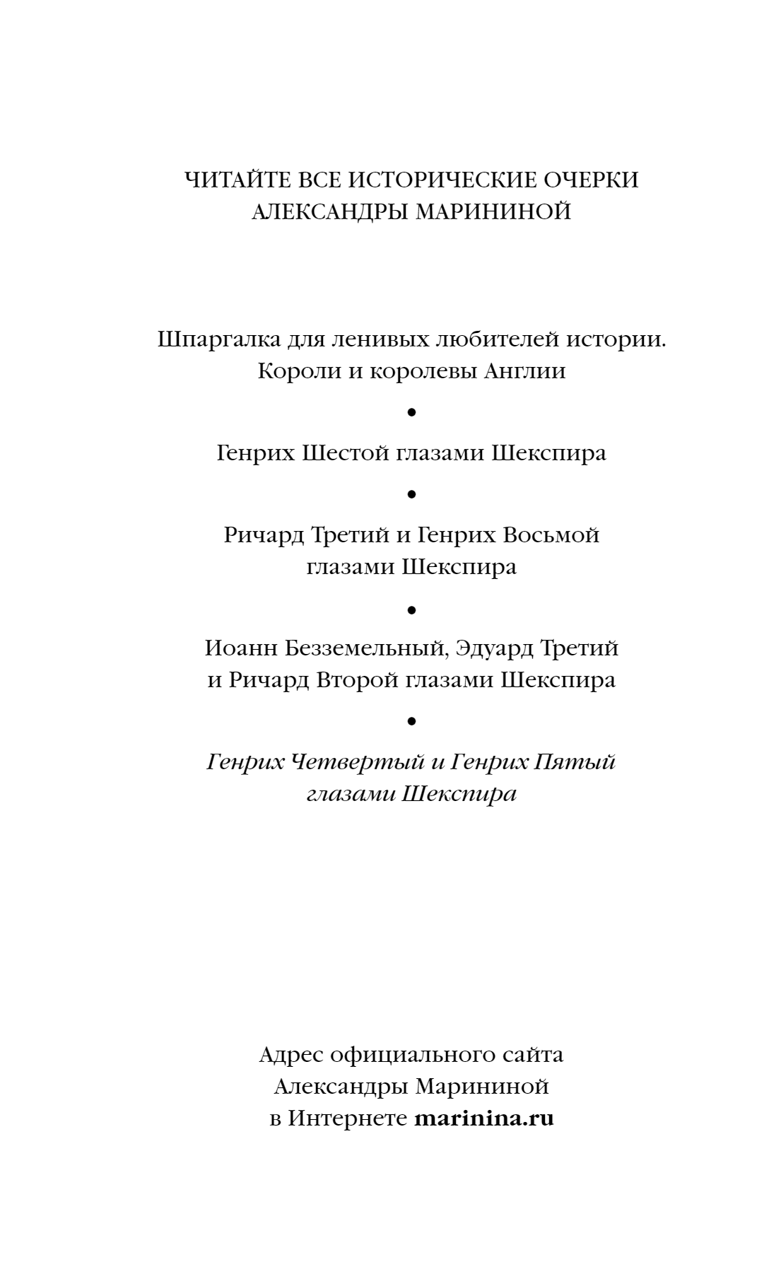 Jaunais princis Henrijs dzīvo izlaidīgu dzīvi kopā ar jautro Falstafu un citiem biedriem. Taču tad mirst viņa tēvs Henrijs Ceturtais. Un jaunais karalis Henrijs Piektais negaidīti sagrābj varu. Viņš tic: Dievs un Anglija gaida, kad viņš iekaros Franciju, un tajā pašā laikā - franču princeses Katrīnas, Trakā karaļa meitas, roku un sirdi… Aleksandra Marinina piedāvā aizraujošu vēsturisku pētījumu par to, kāpēc valdnieki triumfē kaujas laukā, bet zaudē saviem dēmoniem. Galvenais liecinieks un eksperts ir izcilais Viljams Šekspīrs.