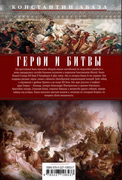 Šīs mācību grāmatas autors ir daudzu ierindas un zemessargu apmācības rokasgrāmatu autors, militārais rakstnieks un pedagogs Konstantīns Abaza. Grāmata tika izdota 19. gadsimta beigās Sanktpēterburgā divos sējumos, no kuriem abi ir iekļauti šajā izdevumā. Tā satur zīmējumus, kartes, plānus un ir sava veida enciklopēdija par karagājieniem, kaujām, uzvarām un sakāvēm no seniem laikiem līdz XIX gadsimta beigām. Jūs uzzināsiet par Spartas karaļa Leonidas varoņdarbiem, Aleksandra Lielā karagājieniem un Napoleona varoņdarbiem... Krusta kariem, simtgadu karu, Amerikas atklāšanu un daudziem citiem notikumiem, kas noteica vēstures gaitu. Grāmata ir rakstīta vienkāršā valodā un, neraugoties uz solīdu vecumu, nav zaudējusi savu aktualitāti.