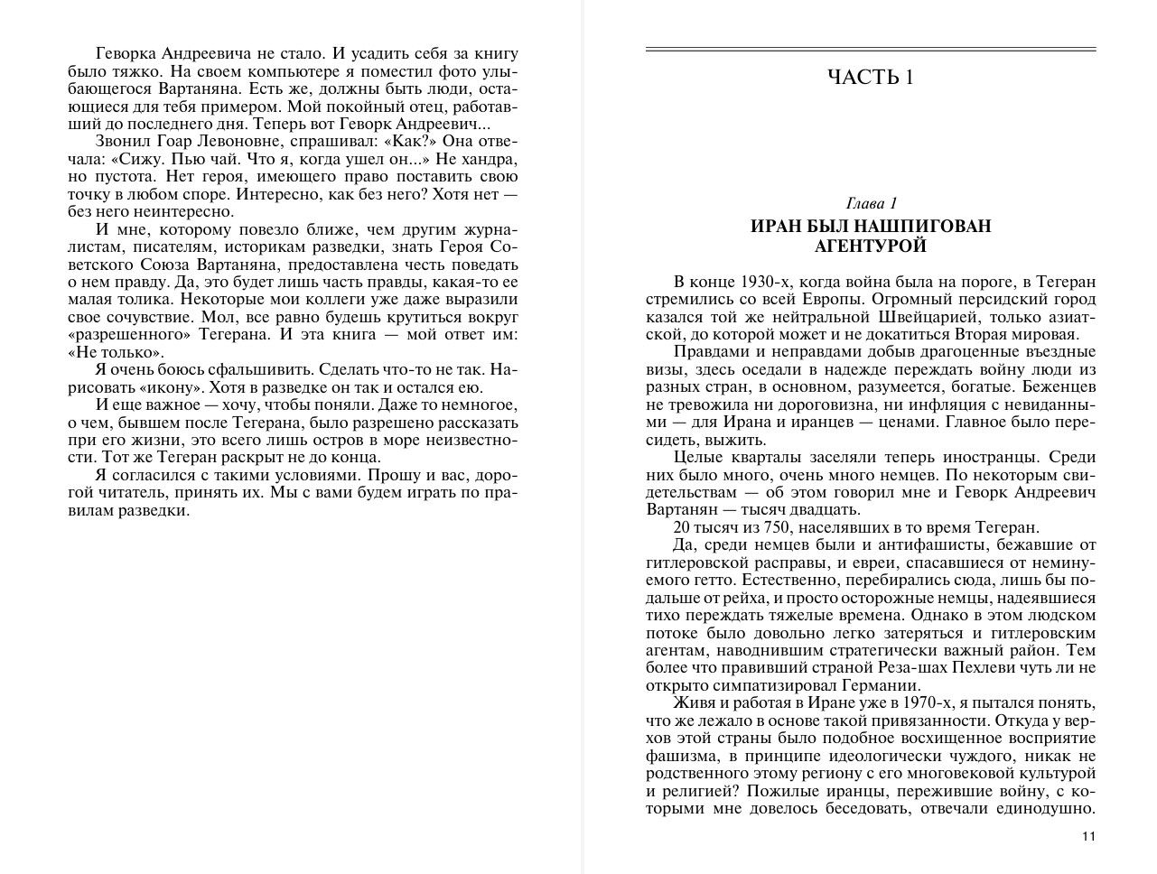 Šis nelegālo spiegu laulātais pāris tiek uzskatīts par vienu no "efektīvākajiem" slepenās izlūkošanas vēsturē. Gevorks Vartanjans bija pirmais mūsu slepenā izlūkdienesta loceklis, kam pēc kara par slepeno darbu aptuveni 100 valstīs tika piešķirts Padomju Savienības varoņa tituls. Vartanjanu ģimene darbojās vairāk nekā 35 gadus "īpašos" (nelikumīgos) apstākļos — tālu no dzimtenes. Viņu "kontaktos" bieži vien bija ārvalstu, izlūkdienestu un bruņoto spēku vadītāji. Līdz nesenam laikam mūsu zināšanas par Gevorka un Gohara Vartanjana darbu aprobežojās ar notikumiem saistībā ar "Lielā trijnieka" drošību 1943. gada Teherānas konferences laikā. Šīs grāmatas autors ir ievērojami paplašinājis šo leģendāro spiegu biogrāfiju laika un ģeogrāfisko tvērumu. Šajā darbā viņam palīdzēja Krievijas Ārējās izlūkošanas dienesta vadītāji, viņu kolēģi un studenti, kuri jaunajam izdevumam sniedza deklasificētus dokumentus no slepeno spiegu personīgajām lietām.