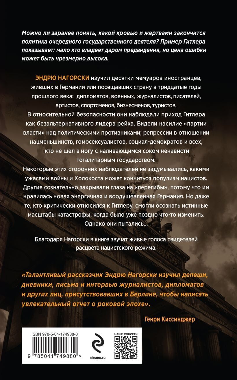 Vai var iepriekš zināt, ar kādām asinīm un upuriem beigsies nākamā valstsvīra politika? Hitlera piemērs rāda, ka tikai nedaudziem cilvēkiem piemīt tālredzības dāvana, bet kļūdas cena var būt pārlieku augsta. autors ir izpētījis desmitiem savu tautiešu, inteliģentu un talantīgu cilvēku, kuri pagājušā gadsimta trīsdesmitajos gados dzīvoja vai viesojās Vācijā, memuāru: amerikāņu diplomāti, militārpersonas, žurnālisti, rakstnieki, mākslinieki, sportisti, uzņēmēji, tūristi. relatīvā drošībā viņi bez alternatīvas vēroja Hitlera kā Reiha līdera izaugsmi. Viņi redzēja "partijas pie varas" vardarbību pret politiskajiem oponentiem, represijas pret nacionālajām minoritātēm, homoseksuāļiem, sociāldemokrātiem un ikvienu, kas nesekoja līdzi totalitārajai valstij, kura smēlās naida sulas. daži no šiem vērotājiem neņēma vērā kara šausmas un holokaustu, kas būs nacistu populisma rezultāts. Citi apzināti pievēra acis uz "ekscesiem", jo viņiem patika jaunā enerģiskā un entuziastiskā Vācija. Taču pat tie, kas bija kritiski noskaņoti pret Hitleru, spēja apjaust patiesos katastrofas apmērus, kad bija jau par vēlu kaut ko mainīt. Tomēr viņi centās... Autors pats daļēji atkārtoja šo cilvēku likteni: kā neuzticams pasaules vadošā medija (Newsweek) korespondents viņš tika izraidīts no PSRS "skrūvju savilkšanas" un padomju karaspēka ievešanas Afganistānā laikā. Pateicoties Nagorskim, grāmatā izskan to amerikāņu dzīvās balsis, kuri bija liecinieki nacistiskā režīma uzplaukumam.