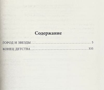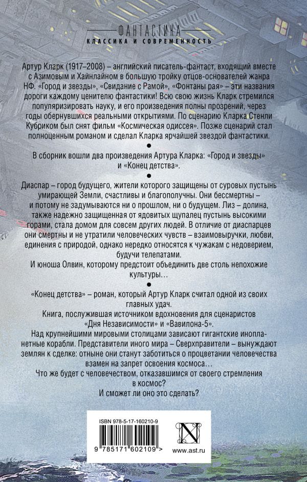 Kolekcijā iekļauti divi Artura Klārka darbi: “Pilsēta un zvaigznes” un “Bērnības beigas” Diaspar – nākotnes pilsēta, kuras iedzīvotāji ir pasargāti no mirstošās Zemes skarbajiem tuksnešiem, laimīgiem un pārticīgiem. Viņi ir nemirstīgi un tāpēc nedomā par pagātni vai nākotni. Liz – ieleja, kas arī droši aizsargāta no augstu kalnu indīgajiem tuksnešu taustekļiem, ir kļuvusi par mājvietu ļoti dažādiem cilvēkiem. Atšķirībā no diaspartiešiem viņi ir mirstīgi, un nav zaudējuši cilvēku jūtas - savstarpējo palīdzību, mīlestību, vienotību ar dabu - bet bieži pret svešiniekiem izturas ar neuzticību, esot telepāti. Un jaunais vīrietis Alvins, kuram ir jāapvieno divas tik atšķirīgas kultūras. The End of Childhood ir romāns, kuru Arturs Klārks uzskatīja par vienu no viņa lielākajiem panākumiem. Grāmata iedvesmoja Neatkarības dienas un Babilonijas 5 rakstniekus. Milzu citplanētiešu kuģi mitinās pasaules lielākajās galvaspilsētās. Citas pasaules pārstāvji – Super-rulētāji – piespiež zemesriekstus noslēgt vienošanos: turpmāk viņi rūpēsies par cilvēces labklājību apmaiņā pret kosmosa izpētes aizliegumu. Kas notiks ar cilvēci, kas ir atteikusies no kosmosa meklējumiem? Un... vai tā var?
