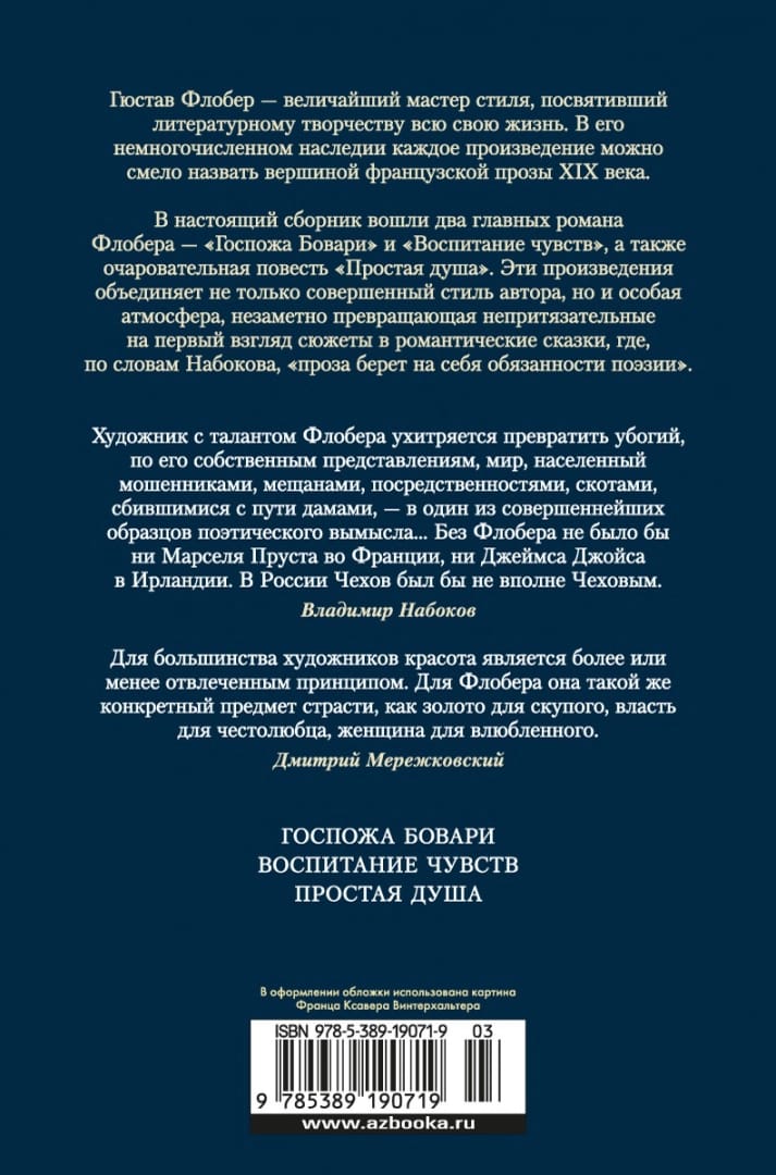 Gustavs Flabērs ir izcilākais stila meistars, kas ar ārkārtīgu rūpību pabeidz savus darbus. Katru no viņa nedaudzajiem literārajiem mantojumiem var droši dēvēt par XIX gadsimta franču prozas virsotni. Šajā krājumā iekļauti divi nozīmīgākie Flabēra romāni - "Madame Bovari" un "Jūtu audzināšana", kā arī burvīgais stāsts "Vienkāršā dvēsele". Šos darbus vieno ne tikai autora nevainojamais stils, bet arī īpašā atmosfēra, kas no pirmā acu uzmetiena nepretenciozus sižetus nemanāmi pārvērš romantiskās pasakās, kurās, Nabokova vārdiem runājot, "proza uzņemas dzejas pienākumus".
