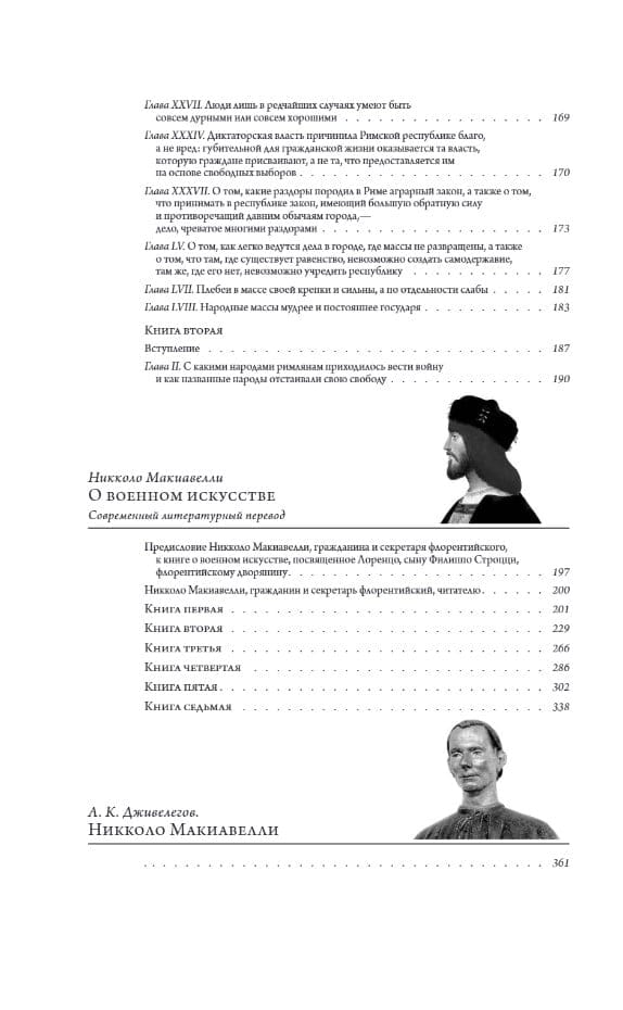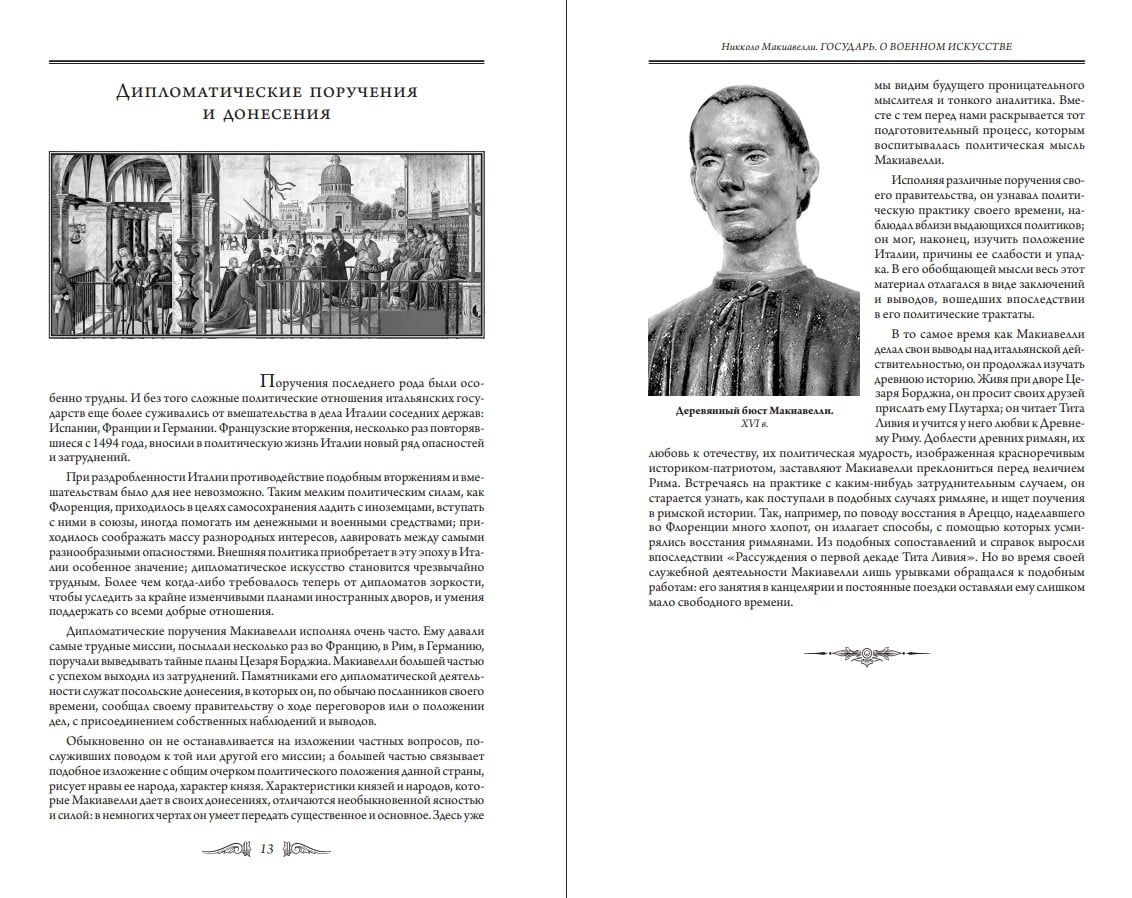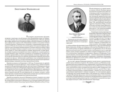 Filozofs un domātājs Nikolo Makjavelli, bez kura nav iespējams iedomāties renesanses Itāliju, atstāja aiz sevis, iespējams, mazāk spilgtu zīmi nekā viņa aktīvie, enerģiskie laikabiedri — Bordžiju un Mediči klanu pārstāvji. Dzimis pieticīgu juristu ģimenē, topošais "Prinča" autors nekad nepārstāja mācīties, pašizglītojoties līdz universitātes līmenim, un militāru apvērsumu, trauslu alianšu un prasmīgu intrigu laikmetā palika grāmatu cilvēks, tiecoties pēc ierēdņa karjeras un dzīvojot galvenokārt garīdznieka dzīvi. Viņa ietekme uz renesanses kultūru un filozofiju, un caur to uz visu politisko vēsturi, bija daudz dziļāka. Viņa pozīcija kā varas vērotājam sniedza viņam neizsmeļamu pārdomu vielu, ko Makjavelli ar savu raksturīgo lakonismu un precizitāti izklāstīja savos rakstītajos darbos. Viņa vēsturisko vērtējumu atbilstība viņam nodrošināja gandrīz vai oficiālā viņa sprādzienbīstamā laikmeta hronista slavu, kas joprojām sajūsmina prātus. Viņa asā politiskā intuīcija, dziļās zināšanas militārajās lietās un valsts pārvaldīšanas māksla padarīja viņu par vienu no galvenajām personībām politikas zinātnē. Šajā izdevumā iekļauti divi no Nikolo Makjavelli galvenajiem darbiem: "Princis" (1513) un "Par kara mākslu" (1519–1520).