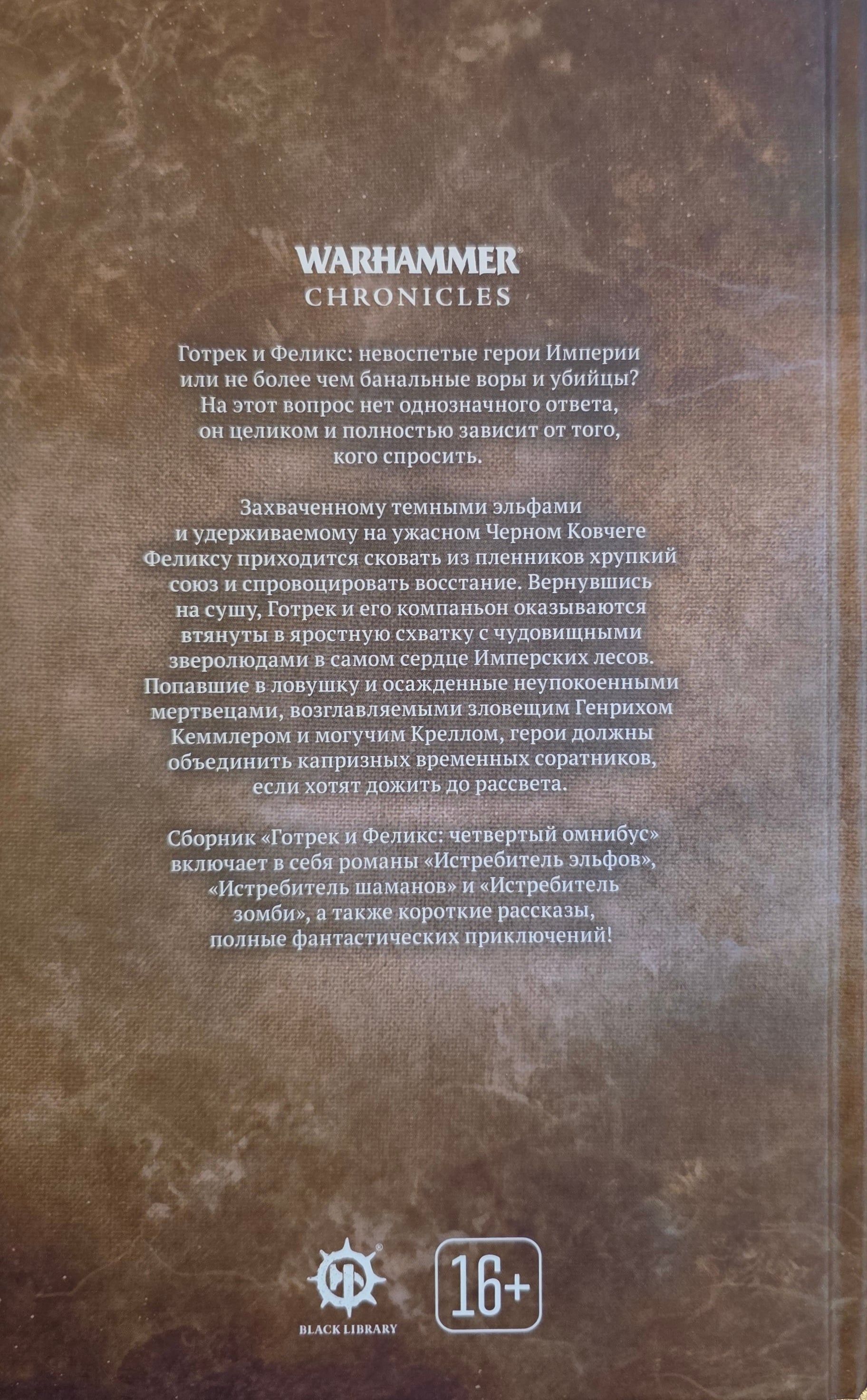 Gotreks un Fēlikss: Krājums Ceturtajā omnibusā ir iekļauti romāni "Elfu mednieks", "Šamaņu mednieks" un "Zombiju mednieks", kā arī īsi stāsti, kas pilni ar fantastiskiem piedzīvojumiem!