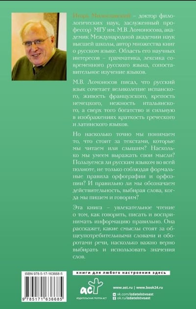 Igors Miloslavskis ir filoloģijas doktors, Maskavas Valsts universitātes emeritētais profesors, Starptautiskās Augstskolu zinātņu akadēmijas akadēmiķis, daudzu grāmatu par krievu valodu autors. Viņa zinātniskās intereses ir gramatika, mūsdienu krievu valodas leksika, valodu salīdzinošā izpēte.