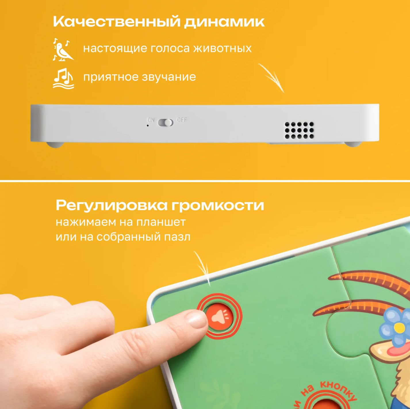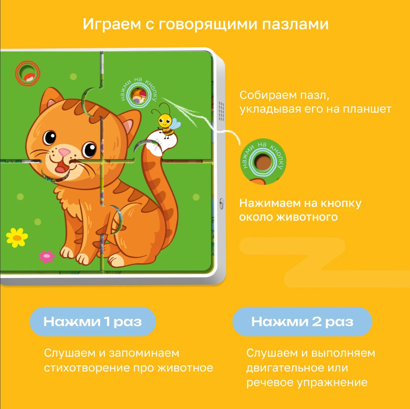 Interaktīvā planšete atpazīst visus puzļu attēlus. Divi spēles režīmi: ar planšeti un ar puzlēm. Tiek paziņoti dzīvnieku nosaukumi un skaņas. Tiek atskaņotas dziesmas un stāsti par dzīvniekiem. Iekļauti dzejoļi par katru dzīvnieku. Runas un motorikas vingrinājumi attīstībai. Skaļuma kontrole ērtai spēlei. 9 krāsainas puzles, kas izgatavotas no bieza kartona. 36 gabaliņi smalko motoriku attīstīšanai. Piemērots bērniem no 1 gada vecuma.