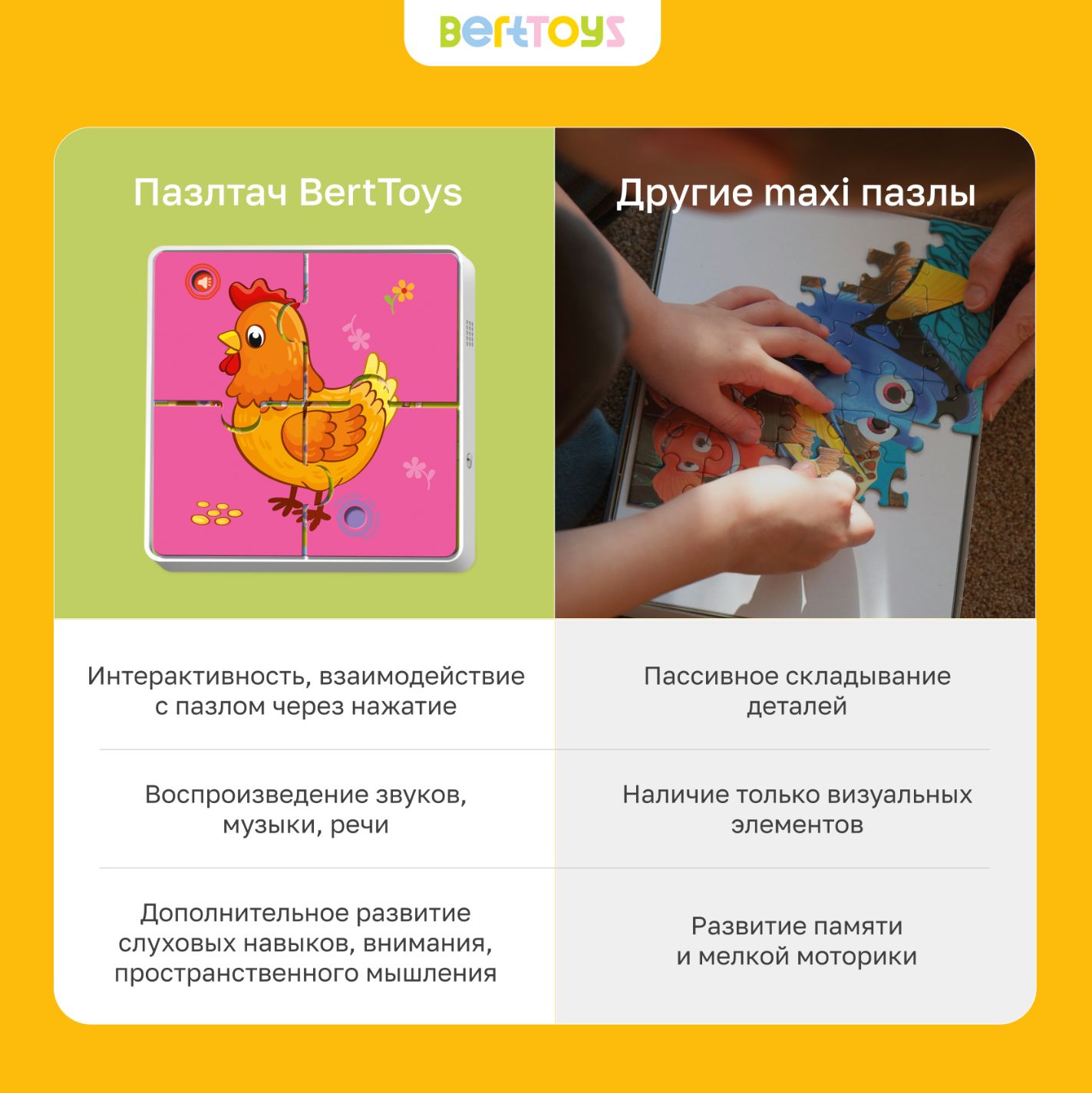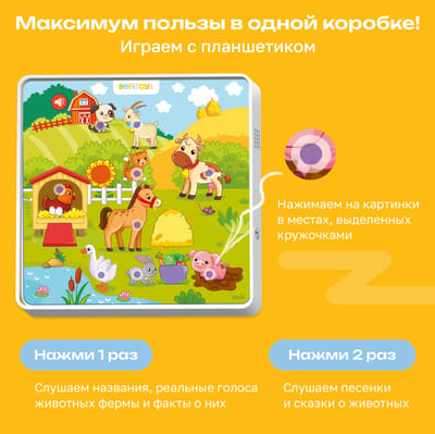Droši materiāli: ABS plastmasa un kartons. Kompakts izmērs: viegli paņemt līdzi. Nav nepieciešams interneta savienojums vai papildu ierīces. Veicina atmiņu, runas un kognitīvās prasmes. Iepazīstina bērnus ar lauksaimniecības dzīvnieku pasauli. Klasisko puzļu spēles un moderno tehnoloģiju apvienojums. Izturīgs: saistošs visu vecumu bērniem. Lietošanas ērtums: intuitīvs pat maziem bērniem.