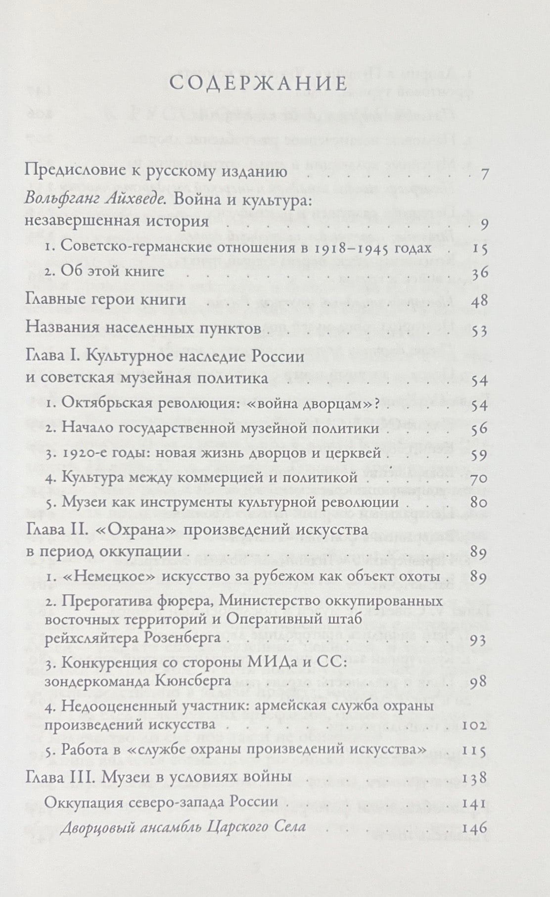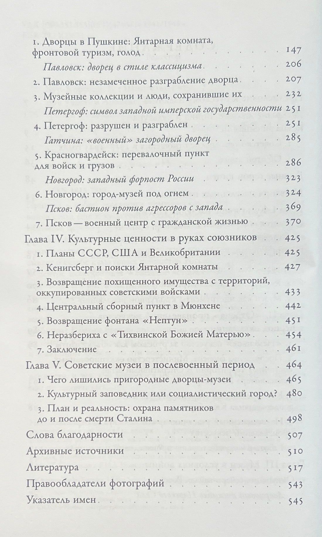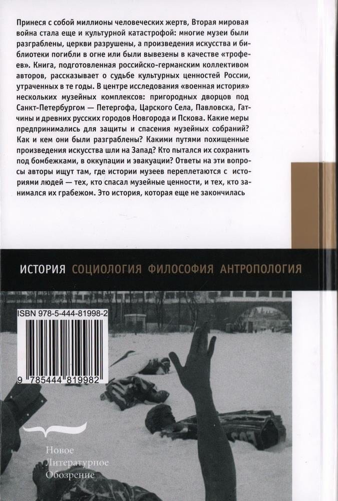 Dzīvotāju upuru skaita ziņā Otrais pasaules karš bija arī kultūras katastrofa: daudzi muzeji tika izlaupīti, baznīcas izpostītas, mākslas darbi un bibliotēkas gāja bojā ugunsgrēkos vai tika aizvesti kā "trofejas". Grāmatā, ko sagatavojis krievu un vācu autoru kolektīvs, stāstīts par to gadu laikā zaudēto Krievijas kultūras dārgumu likteni. Pētījuma centrā ir vairāku muzeju kompleksu "militārā vēsture": piepilsētas piēterhofas - Pēterhofas, Carskoje Selo, Pavlovskas, Gatčinas, kā arī seno Krievijas pilsētu Novgorodas un Pleskavas - piepilsētas pilsētiņu. Kādi pasākumi tika veikti, lai aizsargātu un saglabātu muzeju kolekcijas? Kā un kas tās izlaupīja? Pa kādiem ceļiem nozagtie mākslas darbi nokļuva Rietumos? Kas centās tos saglabāt bombardēšanas, okupācijas un evakuācijas laikā? Autori meklē atbildes uz šiem jautājumiem, kur muzeju stāsti savijas ar cilvēku stāstiem - gan to, kas glāba muzeju dārgumus, gan to, kas tos izlaupīja. Tas ir stāsts, kas vēl nav beidzies...