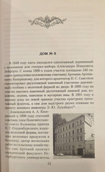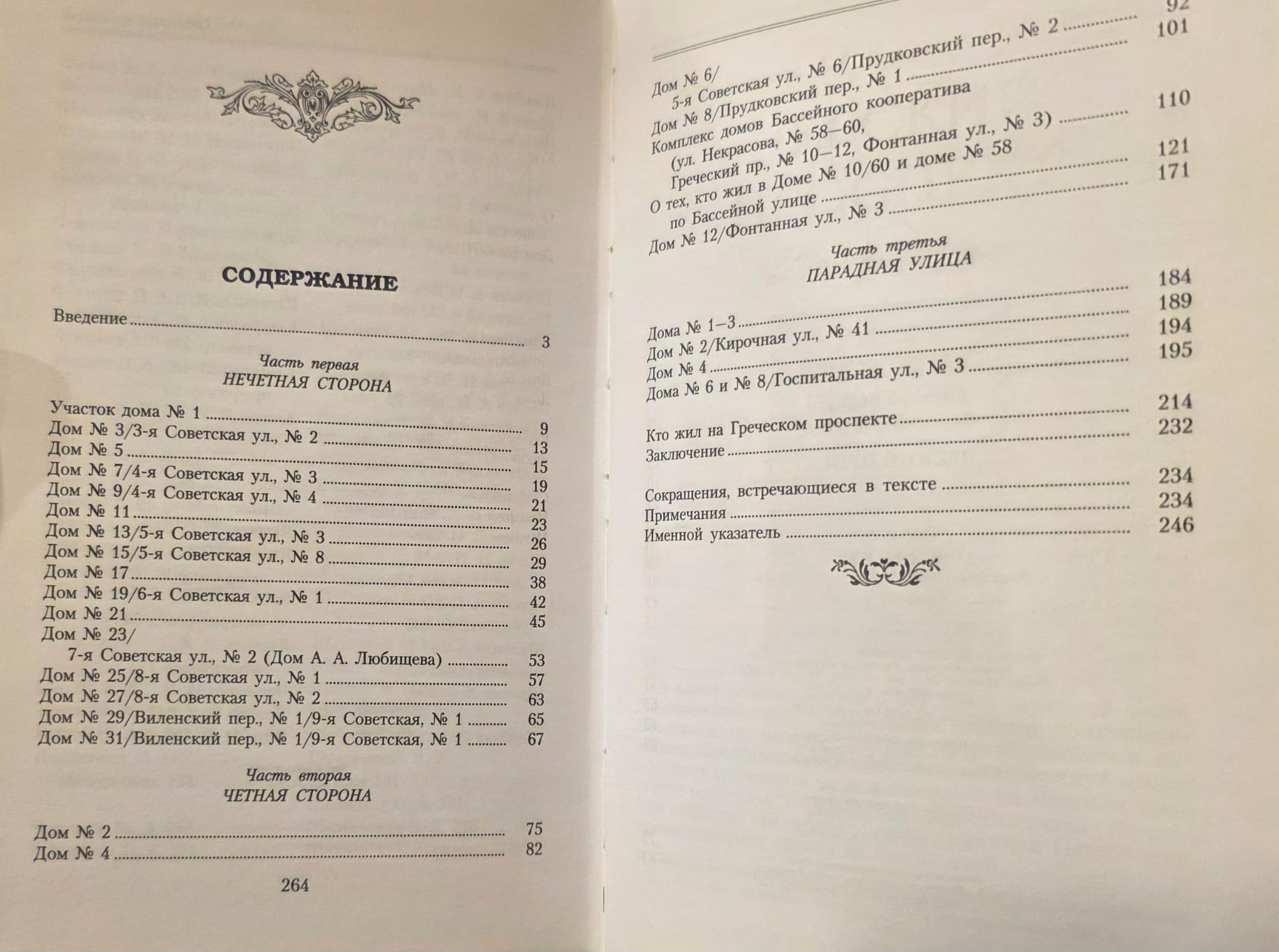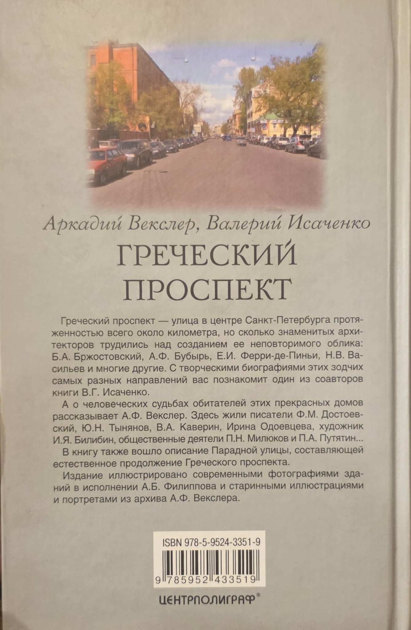 Grečeska prospekts ir iela Sanktpēterburgas centrā, tikai aptuveni kilometru gara, taču tās unikālo izskatu ir veidojuši daudzi slaveni arhitekti: B. A. Brožovskis, A. F. Bubirs, E. I. Ferri de Piņji, N. V. Vasiļjevs un daudzi citi. Viens no grāmatas līdzautoriem V. G. Isačenko iepazīstinās jūs ar šo arhitektu radošajām biogrāfijām, kas pārstāv plašu disciplīnu klāstu. A. F. Vekslers atstāsta šo skaisto ēku iedzīvotāju dzīvi. Šeit dzīvoja rakstnieki F. M. Dostojevskis, Ju. N. Tiņanovs, V. A. Kaverins, Irina Odojevceva, māksliniece I. Ja. Bilibins un sabiedriskās personas P. N. Milukovs un P. A. Putjatins. Grāmatā ir iekļauts arī Paradnajas ielas, Grečeska prospekta dabiska pagarinājuma, apraksts.