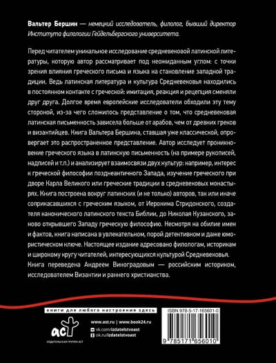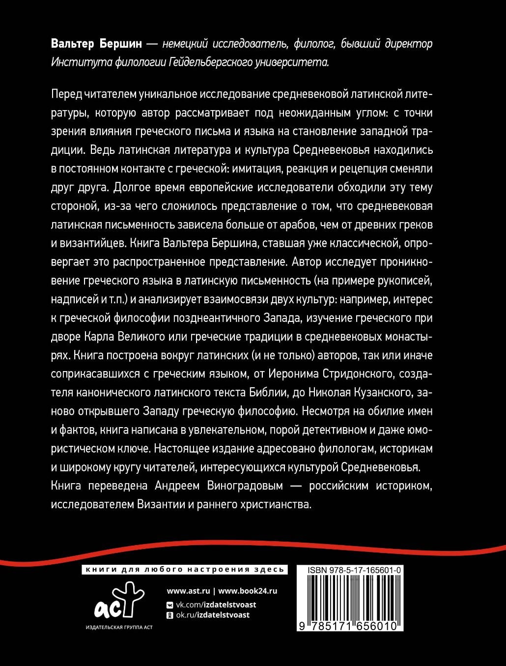 Lasītāja priekšā ir unikāls viduslaiku latīņu literatūras pētījums, kuru autore aplūko negaidītā rakursā: no grieķu rakstības un valodas ietekmes uz Rietumu tradīcijas veidošanos skatu punkta. Galu galā latīņu literatūra un viduslaiku kultūra bija pastāvīgā saskarē ar grieķu valodu: atdarināšana, reakcija un uztveršana aizstāja viena otru. Ilgu laiku Eiropas pētnieki no šīs tēmas izvairījās, līdz ar to radās doma, ka viduslaiku latīņu rakstība bija vairāk atkarīga no arābiem, nevis no senajiem grieķiem un bizantiešiem. Valtera Beršina grāmata, kas jau kļuvusi par klasiku, atspēko šo plaši izplatīto domu. Autors pēta grieķu valodas iespiešanos latīņu rakstībā (izmantojot manuskriptu, uzrakstu u.c. piemēru) un analizē attiecības starp divām kultūrām: piemēram, interesi par grieķu filozofiju vēlīnās antīkajos Rietumos, grieķu valodas apguvi plkst. Kārļa Lielā galms jeb grieķu tradīcijas viduslaiku klosteros. Grāmata ir veidota, balstoties uz latīņu (un ne tikai) autoriem, kuri vienā vai otrā veidā ir saskārušies ar grieķu valodu, no Stridona Jeroma, Bībeles kanoniskā latīņu teksta radītāja, līdz Nikolajam no Kuzas, kurš no jauna atklāja grieķu valodu. filozofija Rietumiem. Neskatoties uz vārdu un faktu pārpilnību, grāmata ir uzrakstīta aizraujošā, reizēm detektīvi un pat humoristiskā manierē. Šis izdevums ir adresēts filologiem, vēsturniekiem un plašam lasītāju lokam, kurus interesē viduslaiku kultūra. Grāmatu tulkojis Andrejs Vinogradovs, krievu vēsturnieks, Bizantijas un agrīnās kristietības pētnieks.