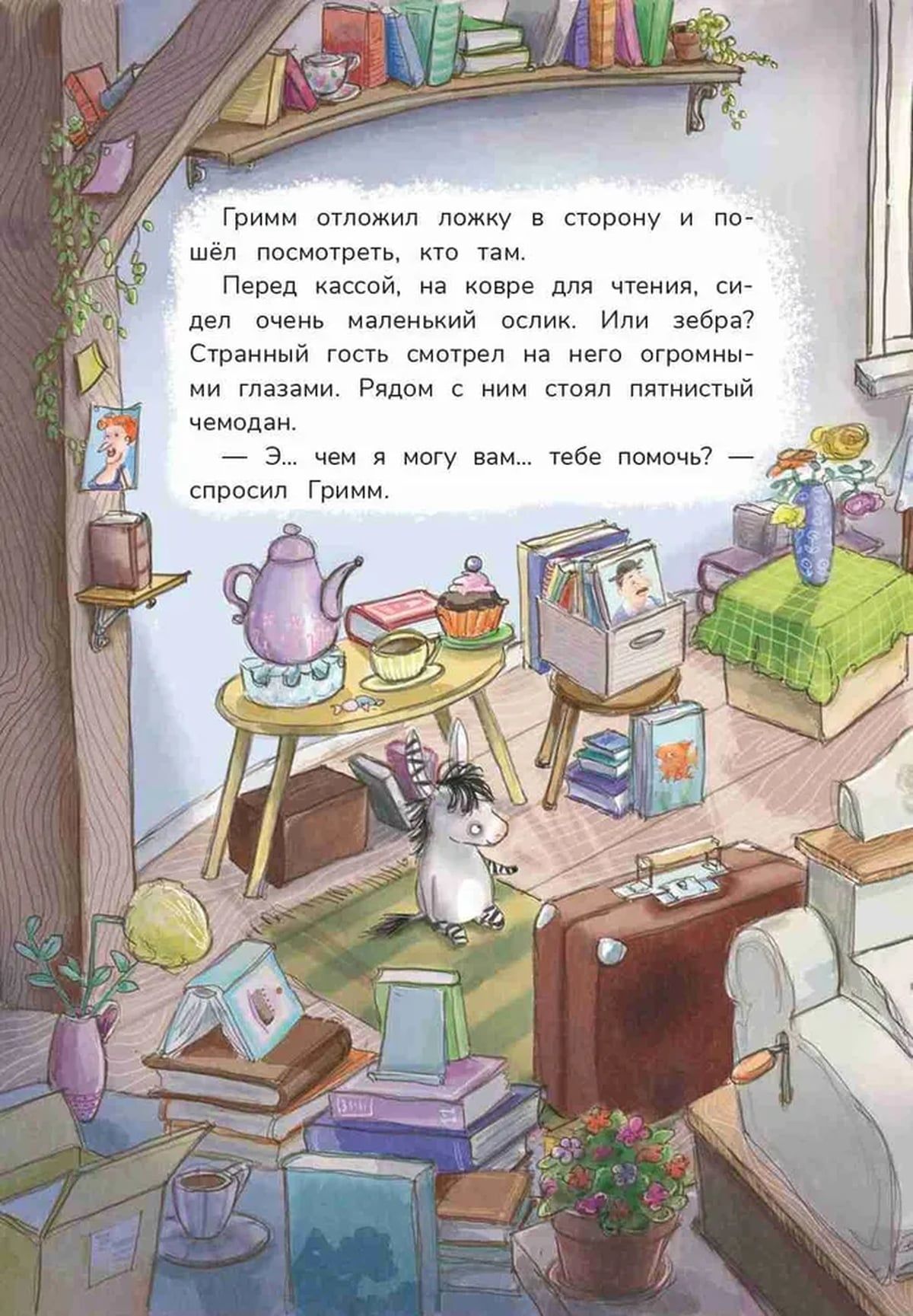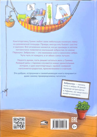 Grāmatu tirgotājs Grims mīl savu mazo grāmatu veikalu ciemata laukumā. Tiesa, dažreiz viņš kļūst skumjš un vientuļš. Viss mainās acumirklī, kad kādu dienu viņa mājīgajā veikaliņā parādās maza zebra vārdā Spalva. Zebra ir pa pusei ēzelis un pa pusei zebra. Pa druskai no katra, un labākais no abiem.