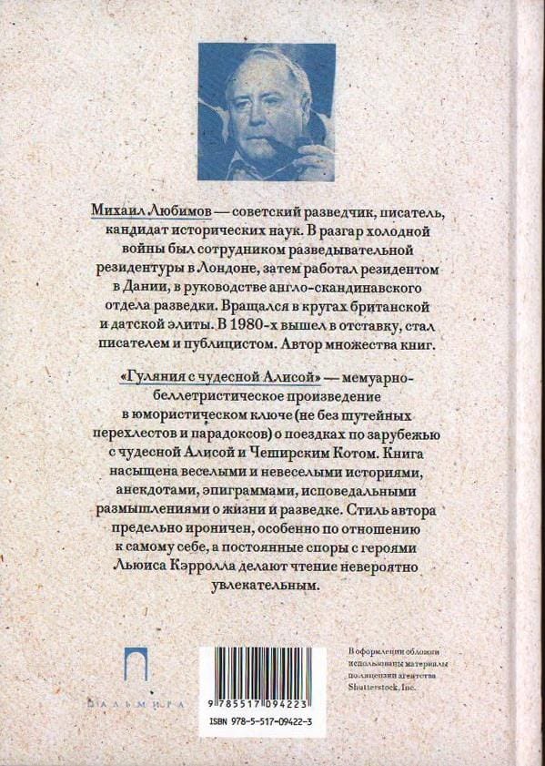 "Pastaigas ar brīnumaino Alisi" - atmiņas un pārdomas par slavenā padomju izlūkdienesta virsnieka un rakstnieka Mihaila Ļubimova piedzīvojumiem, kas rakstītas dialogā ar Lūisa Kerolla varoņiem - Alisi un Češīras kaķi.