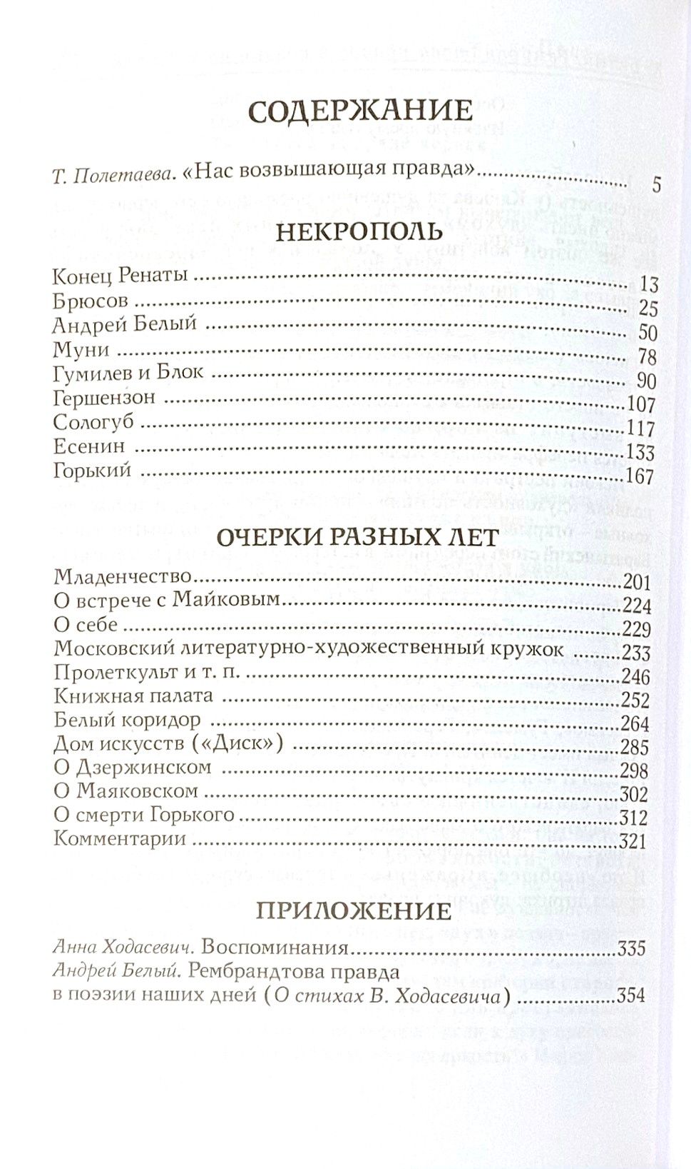 Grāmatā iekļauts 1939. gadā autora sastādītais krājums “Nekropole”, dažādu gadu esejas, kas publicētas Krievijas un ārvalstu izdevumos, kā arī viņa sievas Annas Hodasevičas atmiņas un Andreja Belija raksts par Hodaseviča dzeju.