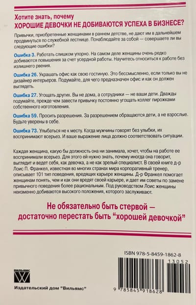 Kas jūs kavē gūt panākumus karjerā? Atbildi atradīsiet grāmatā "Jaukas meitenes negūst panākumus biznesā" — unikālā kļūdu apkopojumā, ko daudzas sievietes pieļauj darba vietā, pat to neapzinoties. Šīs kļūdas apkopoja un aprakstīja Dr. Loisa P. Frankela, kura daudzus gadus ir strādājusi par personāla treneri dažādos uzņēmumos. Visas grāmatā minētās kļūdas ir sagrupētas pēc tēmas — domāšanas stila, izskata, runas veida un citas. Pēc katras kļūdas aprakstīšanas Dr. Frankela sniedz padomus, kā to labot un izvairīties no tās nākotnē. Turpmāk jūsu karjera ir pilnībā jūsu rokās. Atcerieties — jums nav jābūt niķīgai; vienkārši beidziet uzvesties kā mazai meitenei! Šī grāmata ir paredzēta ambiciozām sievietēm jebkurā vecumā un profesijā, kā arī vadītājiem, kuri ir ieinteresēti darbinieku snieguma optimizēšanā.