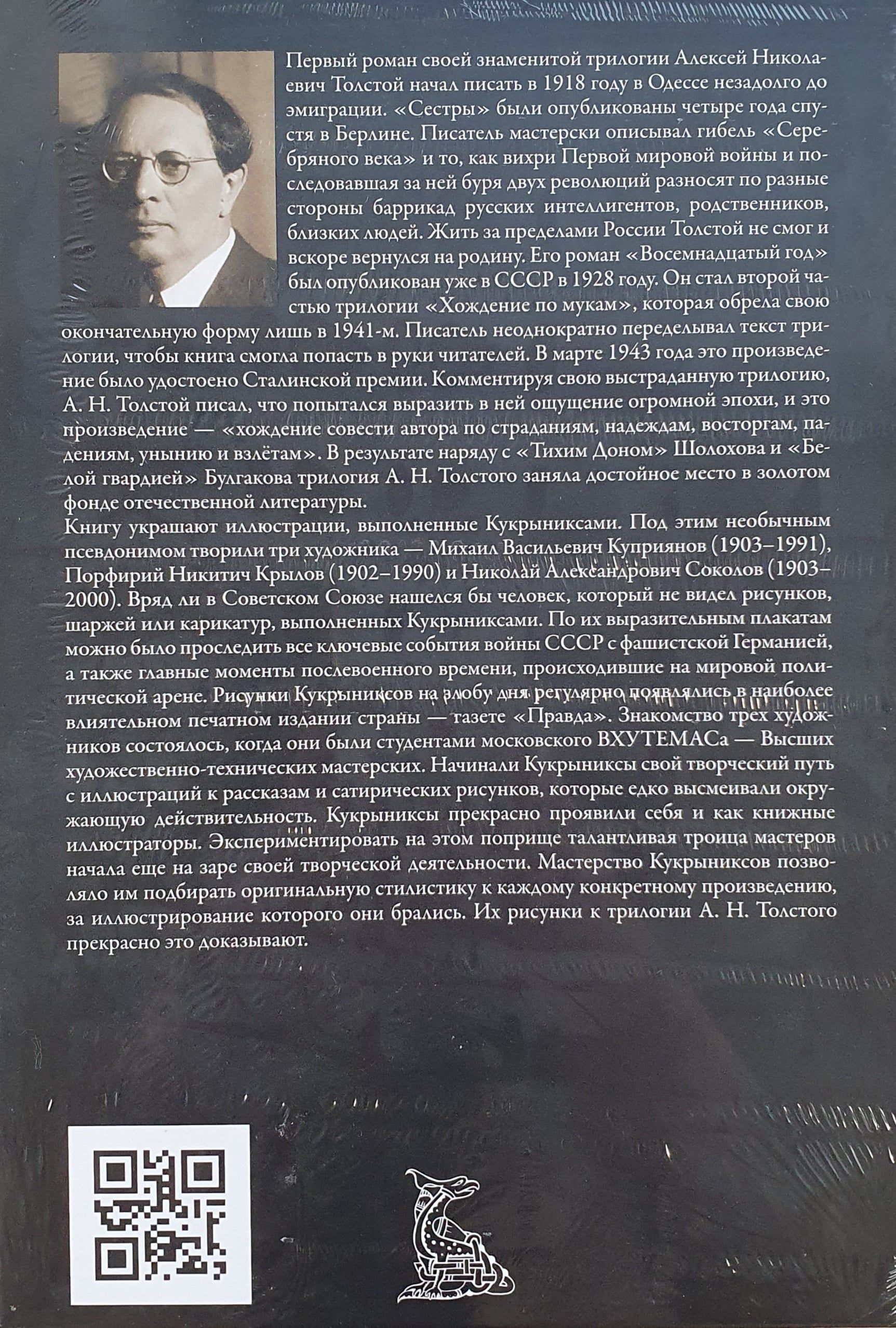 Aleksejs Tolstojs slavenās triloģijas pirmo romānu sāka rakstīt 1918. gadā Odesā īsi pirms emigrācijas. "Māsas" tika publicētas četrus gadus vēlāk Berlīnē. Rakstnieks meistarīgi aprakstīja "Sudraba laikmeta" norietu un to, kā Pirmā pasaules kara virpuļi un tam sekojošā divu revolūciju vētra izkliedēja dažādās barikāžu pusēs krievu inteliģenci, radiniekus, mīļotos. Tolstojs nespēja dzīvot ārpus Krievijas un drīz vien atgriezās dzimtenē. Viņa romāns "Astoņpadsmitais gads" tika izdots PSRS 1928. gadā. Tas kļuva par otro daļu triloģijai "Pastaigas mokās", kas savu galīgo formu ieguva tikai 1941. gadā. Rakstnieks vairākkārt pārtaisīja triloģijas tekstu, lai grāmata varētu nonākt lasītāju rokās. 1943. gada martā šis darbs tika apbalvots ar Staļina prēmiju. Komentējot savu daudzslāņaino triloģiju, A. N. Tolstojs rakstīja, ka centies tajā paust milzīga laikmeta izjūtu, un šis darbs - "autora ciešanu, cerību, sajūsmu, kritienu, izmisuma un pacēlumu gājēja sirdsapziņa". Rezultātā līdzās Šolohova "Klusajam Donam" un Bulgakova "Baltajai gvardijai" Tolstoja triloģija ir ieņēmusi pienācīgu vietu krievu literatūras zelta fondā. Grāmatu rotā Kukriņņicka ilustrācijas. Ar šo neparasto pseidonīmu radīja trīs mākslinieki - Mihails Vasiļjevičs Kuprijanovs (1903-1991), Porfrijs Ņikitičs Krilovs (1902-1990) un Nikolajs Aleksandrovičs Sokolovs (1903-2000). Padomju Savienībā gandrīz nebija cilvēka, kas nebūtu redzējis Kukriņikova zīmējumus, karikatūras vai karikatūras. Pēc to izteiksmīgajiem plakātiem bija iespējams izsekot visiem svarīgākajiem notikumiem PSRS karā ar nacistisko Vāciju, kā arī pēckara laika galvenajiem momentiem, kas norisinājās pasaules politiskajā arēnā. Kukryņiksu zīmējumi par dienas ļaunumu regulāri parādījās valsts ietekmīgākajā preses izdevumā - laikrakstā "Pravda". Trīs mākslinieku iepazīšanās notika, kad viņi bija Maskavas VHUTEMAS - Augstākās mākslas un tehnikas darbnīcas - studenti. Savu radošo ceļu Kukriņņiki sāka ar ilustrācijām stāstiem un satīriskiem zīmējumiem, kuros kodolīgi izsmēja apkārtējo realitāti. Kukryniksy lieliski sevi parādīja arī kā grāmatu ilustratori. Eksperimentēt šajā jomā talantīgais meistaru trio sāka savas radošās darbības pirmsākumos. Meistarība Kukryniksy ļāva viņiem izvēlēties oriģinālu stilu katram konkrētajam darbam, kura ilustrēšanai viņi uzņēmās. Viņu zīmējumi triloģijai A. N. Tolstoja triloģijai to lieliski pierāda.