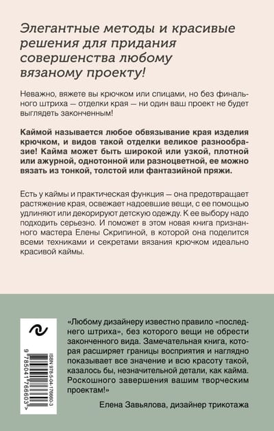 Izziņu grāmata, kas vajadzīga pilnīgi visiem! Adīšana ir īsta māksla, un katrs adīts projekts prasa īpašu uzmanību detaļām. Un, lai izstrādājums izskatītos perfekti, īpaša uzmanība jāpievērš malu apdarei. Apmales ir tas, kas piešķirs jūsu projektam pabeigtu izskatu un padarīs to patiešām elegantu un skaistu. Bet kā izvēlēties perfektu apmali projektam? Kādi tamborēšanas paņēmieni un noslēpumi palīdzēs jums izveidot perfektu apmali? Atbildes uz visiem šiem jautājumiem sniegs atzītās meistares Jeļenas Skripinas jaunā grāmata. Tajā jūs atradīsiet daudzas tamborēšanas metodes un tehnikas, kas palīdzēs jums izveidot skaistu un praktisku apmali jebkuram tamborēšanas projektam. Jūs uzzināsiet, kā izvēlēties pareizo dziju, kā veidot dažādus apdarus - no šauriem līdz platiem, no blīviem līdz ažūriem, no vienkrāsainiem līdz daudzkrāsainiem. Šī ir ērta rokasgrāmata ikvienam, kurš vēlas piešķirt saviem adīšanas projektiem pabeigtu izskatu un padarīt tos patiesi unikālus. Nepalaidiet garām iespēju apgūt visus noslēpumus un tehnikas, lai no atzīta meistara uztamborētu perfektu apmali!