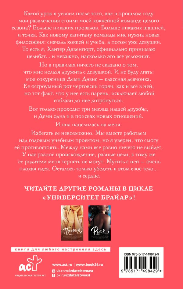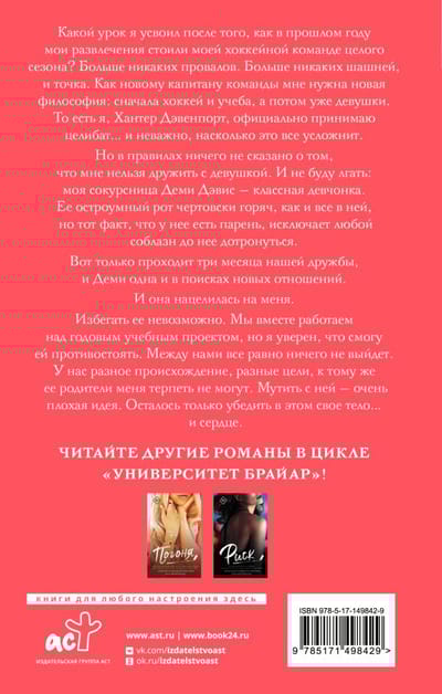 Kādu mācību es guvu pēc tam, kad mana izklaide pagājušajā gadā manai hokeja komandai izmaksāja visu sezonu? Nekādu neveiksmju. Nekādu intrigu, punktu galā. Kā jaunajam komandas kapteinim man ir vajadzīga jauna filozofija: vispirms hokejs un mācības, tad meitenes. Tāpēc es, Hanters Davenports, oficiāli piekopju celibātu... lai cik ļoti tas visu sarežģītu. Taču noteikumos nav teikts, ka es nevaru draudzēties ar meiteni. Un es nemelošu: mana studiju biedre Demi Deivisa ir lieliska meitene. Viņas asprātīgā mute ir tikpat velnišķīgi seksīga kā viss, kas ar viņu saistīts, bet tas, ka viņai ir draugs, novērš jebkādu kārdinājumu viņai pieskarties. Tikai trīs mēnešus pēc mūsu draudzības beigām Demi ir viena un meklē jaunas attiecības. Un viņas mērķis esmu es. Izvairīties no viņas ir neiespējami. Mēs kopā strādājam pie klases gada projekta, bet es esmu pārliecināta, ka varu viņai pretoties. Starp mums tik un tā nekas neizdosies. Mums ir atšķirīga izcelsme, atšķirīgi mērķi, un viņas vecāki mani nevar paciest. Sazināšanās ar viņu ir ļoti slikta ideja. Viss, kas man jādara, ir jāpārliecina mans ķermenis... un mana sirds.