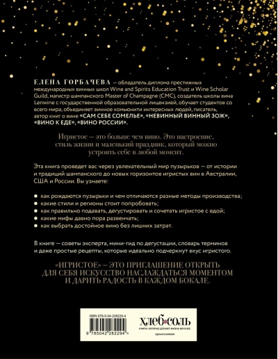 Autore ir Jeļena Gorbačova, vīna eksperte, šampanieša meistare (CMC), šampanieša maģistra līmeņa diploma ieguvēja, prestižo starptautisko vīna skolu Wine and Spirits Education Trust un Wine Scholar Guild diplomu ieguvēja, kā arī Lenwine vīna skolas, kurai ir valsts izglītības licence, dibinātāja. Viņa raksta par sarežģītām tēmām vienkārši un aizraujoši, pārvēršot lasīšanu patiesā degustācijas pieredzē.