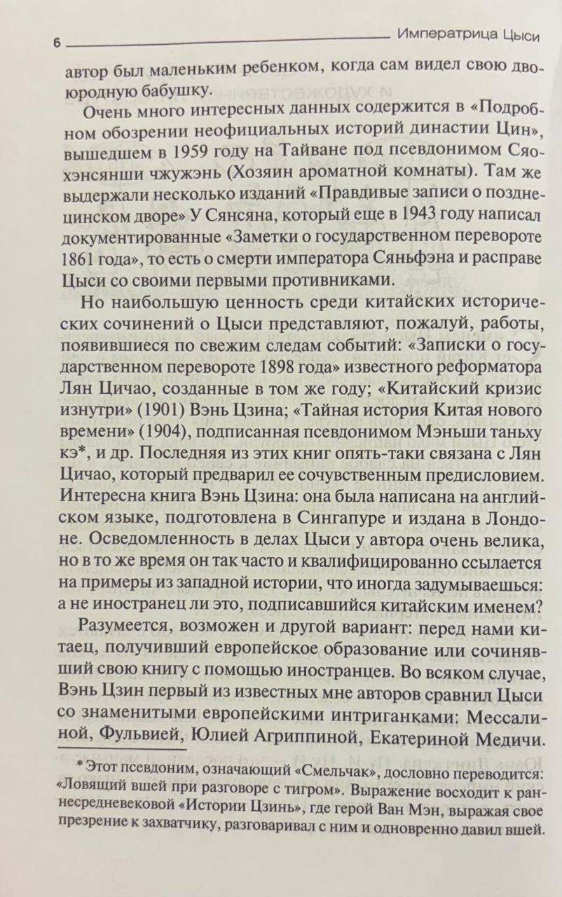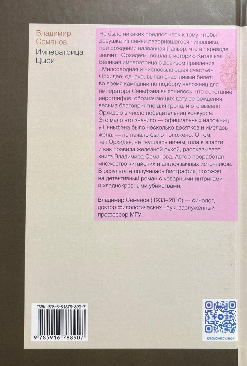 Nebija nekāda iemesla, lai meitene no bankrotējušas amatpersonas ģimenes, dzimusi Lan'er (kas nozīmē "Orhideja"), ierakstītos Ķīnas vēsturē kā Lielā Imperatore ar devīzi "Žēlsirdīgā un Laimes Dāvātāja". Tomēr Orhidejai paveicās: kampaņas laikā, lai izvēlētos konkubīnes imperatoram Sjaņfengam, tika atklāts, ka rakstzīmju kombinācija, kas apzīmēja viņas dzimšanas datumu, bija ļoti labvēlīga tronim, padarot Orhideju par vienu no uzvarētājām. Tas neko nenozīmēja — Sjaņfengam bija vairāki desmiti oficiālu konkubīņu un sieva —, bet tas bija sākums. Vladimira Semanova grāmata stāsta par Orhidejas nākšanu pie varas, ne no kā nevairoties, un to, kā viņa valdīja ar dzelzs dūri. Autors ir rūpīgi izpētījis daudzus ķīniešu un angļu valodas avotus. Rezultāts ir biogrāfija, kas atgādina detektīvromānu, ar nodevīgām intrigām un aukstasinīgām slepkavībām.