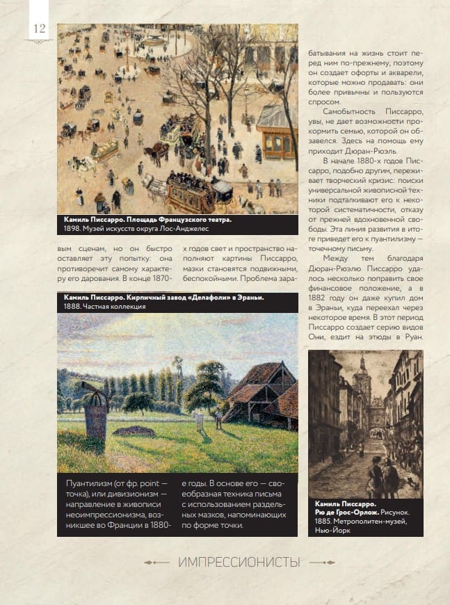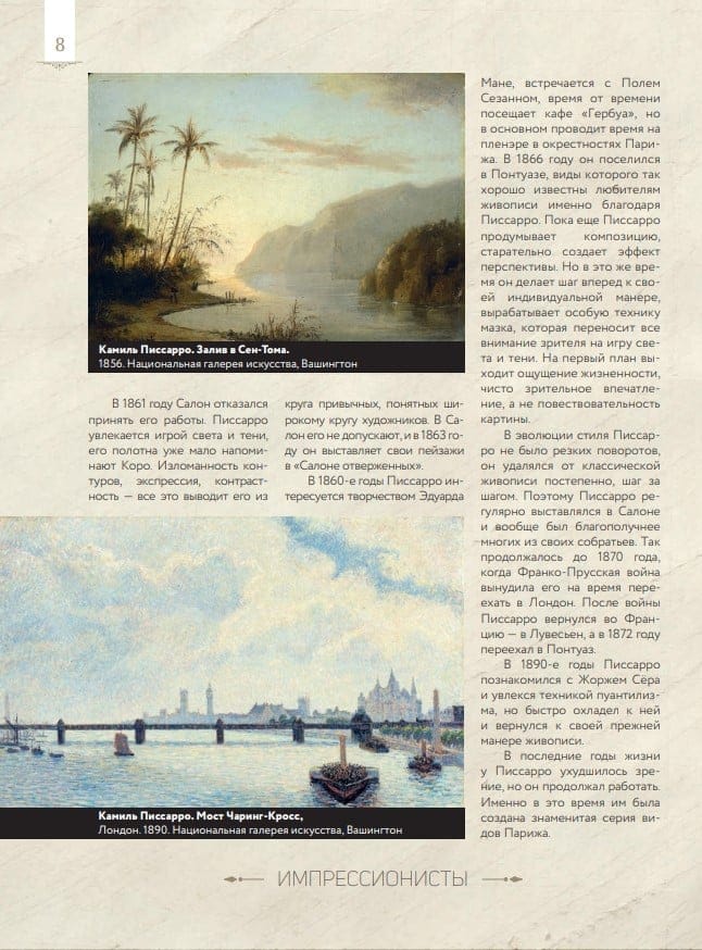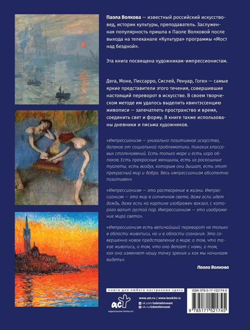 Mēs varam stāstīt par attēlu, ja pats attēls ir stāsts. Tikai tad mēs varam atrast pareizos vārdus, lai to aprakstītu. Bet kā mēs varam runāt par gleznu, kas pati par sevi ir šāda informācija, bet tai nav stāsta, kas mums sniegtu kādu pavedienu? Jūs saprotat visu, kas šeit attēlots, bet kā to izteikt vārdos? Jūsu priekšā ir slavenās padomju un Krievijas mākslas zinātnieces, kultūrvēsturnieces un pedagoģes Paolas Volkovas unikāls dāvanu izdevums "Impresionisti: mīļākās gleznas". Tas veidots kā krāšņi ilustrēts albums greznā vāciņā, kurā apkopoti daudzi aizraujoši fakti par lielajiem impresionisma māksliniekiem, detalizēti viņu gleznu fragmenti un autores dziļākās pārdomas par mākslu un jaunradi kopumā. Pateicoties grāmatai "Impresionisti: mīļākās gleznas", jūs varēsiet iepazīties ar spilgtāko impresionisma laikmeta tēlotājas mākslas pārstāvju dzīvi un daiļradi. Degā, Monē, Pišarro, Sislejs, Renuārs, Gogēns - spilgtākie šī virziena pārstāvji radīja īstu revolūciju mākslā. Savā radošajā metodē viņiem izdevās izcelt glezniecības kvintesenci, notvert vienkāršību un laiku, apvienot gaismu un formu. Materiāls grāmatā ir sakārtots tā, lai būtu ērti aplūkot atsevišķus gleznu fragmentus un uzreiz atgriezties pie Paolas Volkovas komentāriem, kas vienmēr atrodas blakus tēmai. Grāmata paredzēta tiem, kas novērtē mākslu un vēlas iegūt patiesi vērtīgu dāvanu savai bibliotēkai.