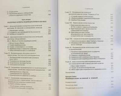 Autors sāk ar sociālās filozofijas emancipāciju no reliģijas un teoloģijas (Hobss un Mandevils), pēta klasiskās individuālisma doktrīnas kodola veidošanās procesu (fiziokrāti, Hjūms, Smits, Rikardo, Maltuss) un tās dažādo aspektu slīpēšanu (Denuārs, Mills). Pēc tam A. Šacs analizē Bastiā, Tokvīla, Taina, Spensera un kristīgo domātāju koncepcijas. 19. gadsimta otrajā pusē pēkšņais demokrātijas triumfs ar nenobriedušu vēlētāju masu pieprasīja Francijā ekonomiskā un politiskā liberālisma apvienošanu liberālās demokrātijas doktrīnas ietvaros. Noslēdzošās nodaļas ir veltītas tam, ko autors uzskata par individuālisma strupceļiem - anarhistiskajam un aristokrātiskajam. Individuālisms cenšas katru indivīdu novest līdz pilnīgas attīstības stāvoklim, mācot viņam, ka viņš nav nekas un neko nevar izdarīt bez citu palīdzības un ka viņu laime un labklājība noved pie viņa laimes un labklājības, tādējādi pakāpeniski paplašinot jomu, līdz kurai sniedzas viņa paša intereses. Individuālisms visas sociālās reformas pakārto divu institūciju - indivīda brīvības un privātīpašuma - ievērošanai. Šo cieņu attaisno to sociālā lietderība, jo tās nosaka konkrēto spontāni izveidojušos ekonomisko kārtību