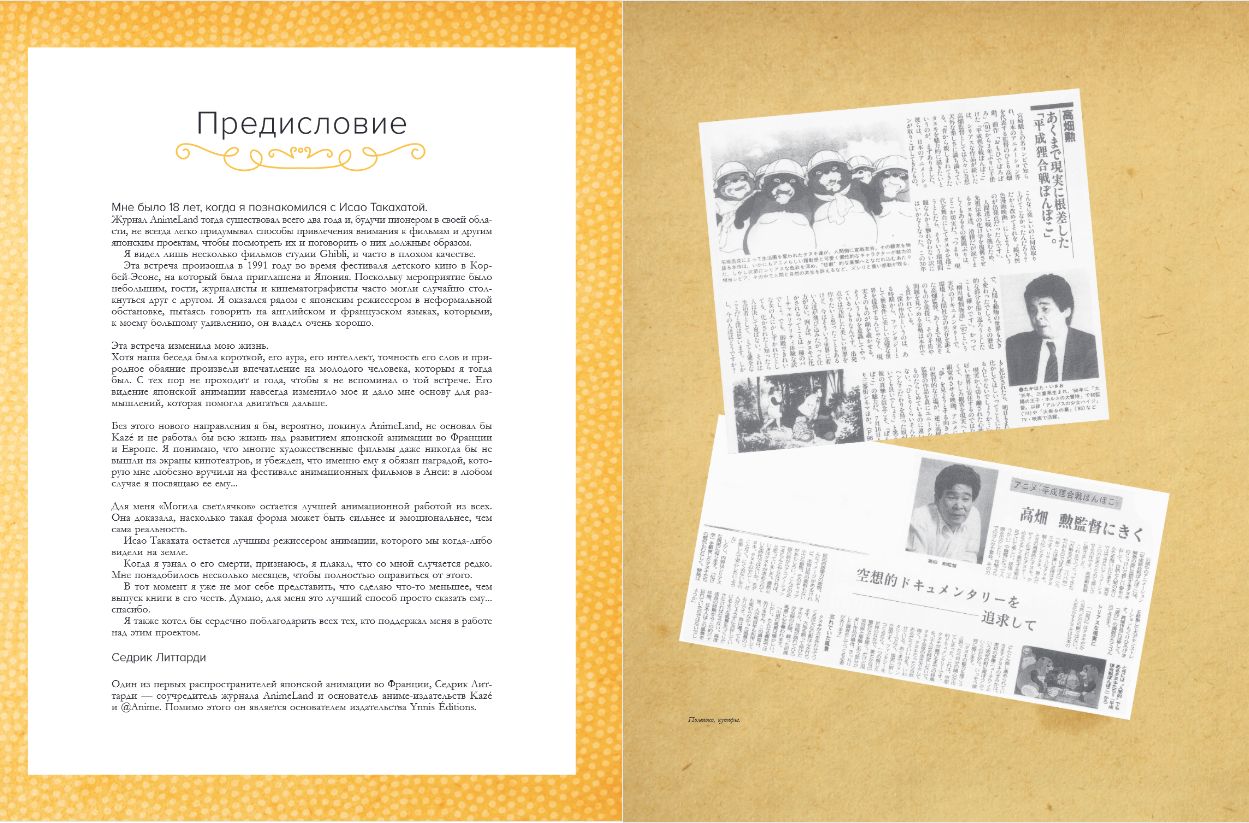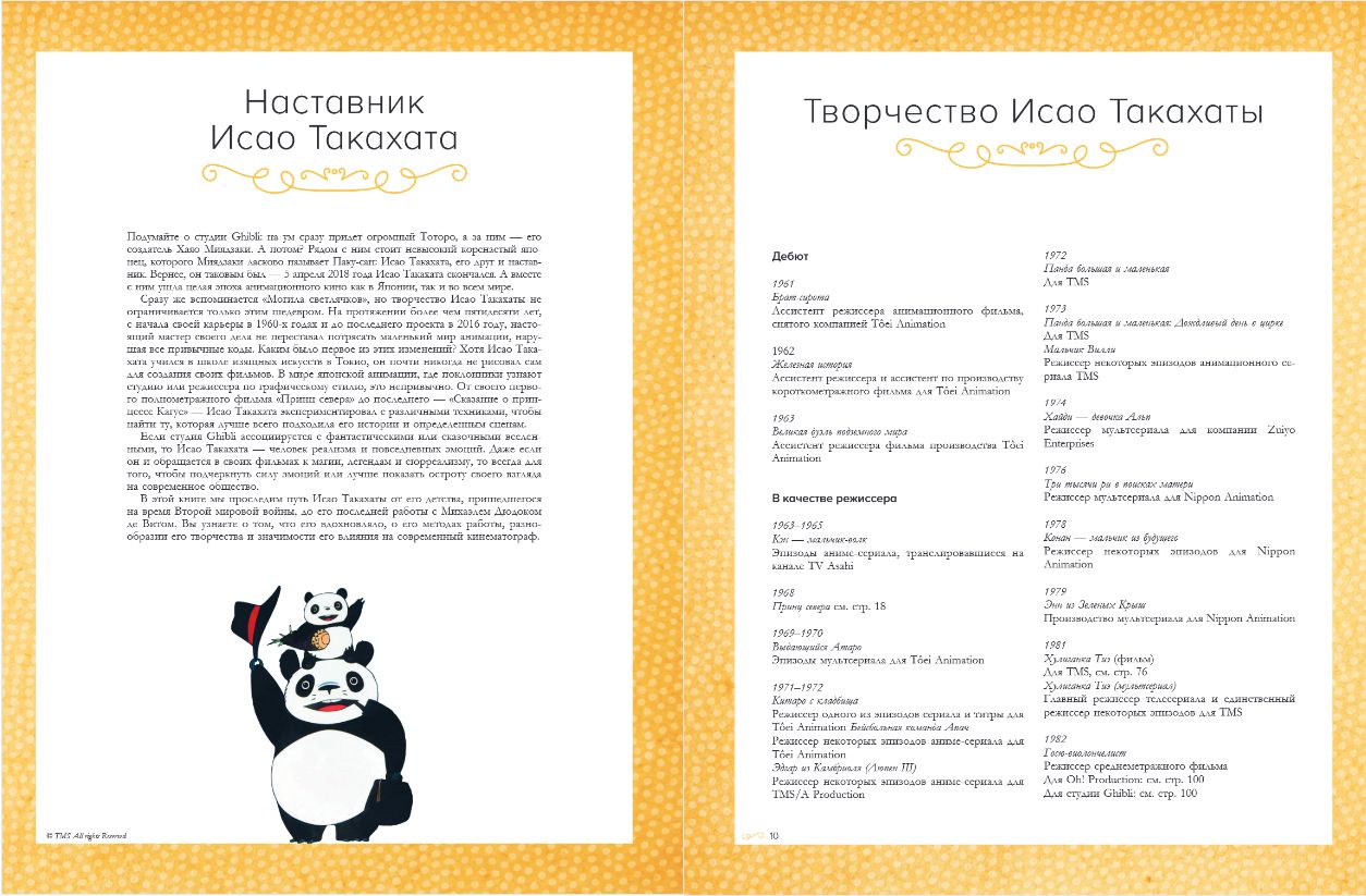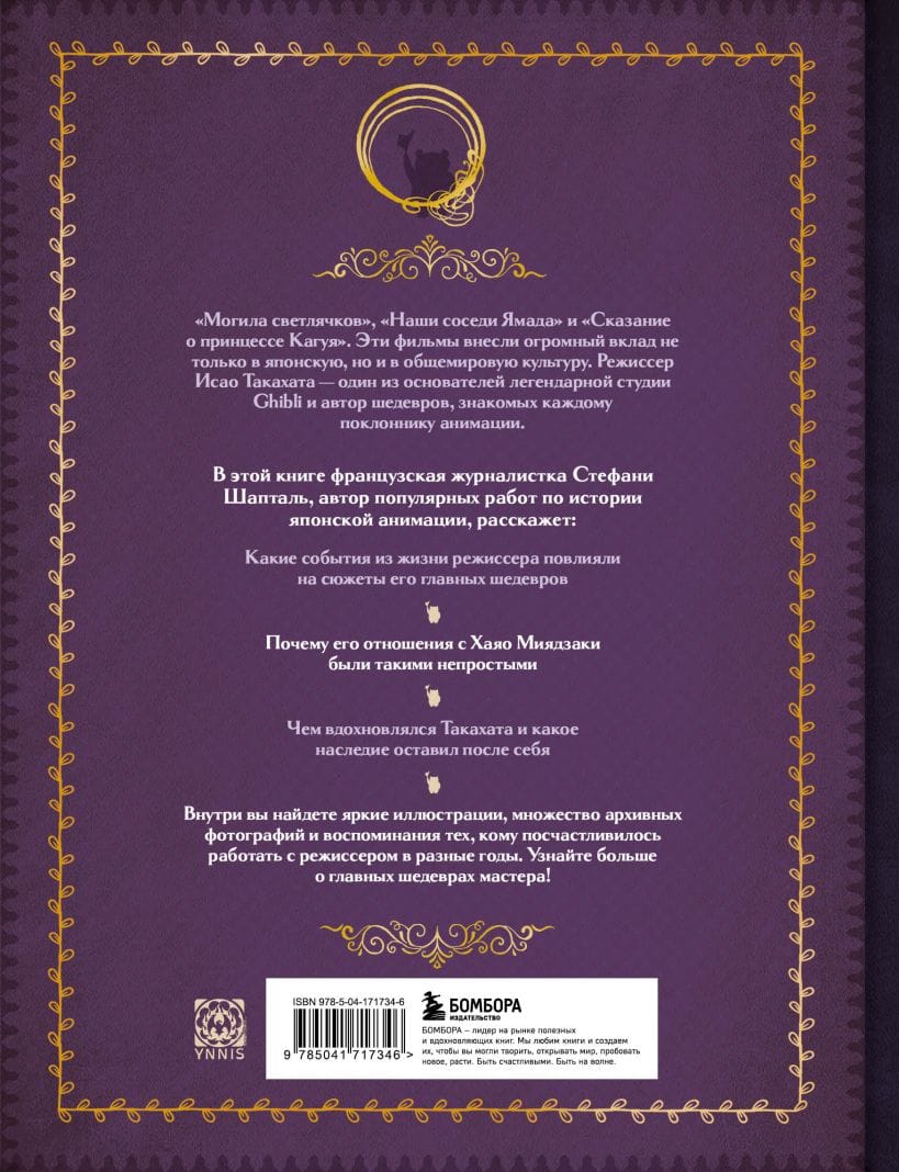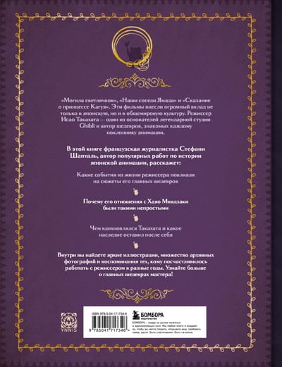 Franču žurnāliste Stafānija Šaptāla savā grāmatā ieved mūs radītāja darbnīcā un atrod atbildes uz daudziem jautājumiem: — Kā veidojās Takahatas ceļš no Toei uz Studio Ghibli? — Kāda ir režisora unikālā radošā metode? — Kas iedvesmoja animatoru radīt animācijas filmas? — Kāda ietekme bija Takahatas darbiem uz Japānas un pasaules animāciju? Grāmata būs lieliska dāvana ikvienam japāņu animācijas cienītājam, pastāstīs daudz nezināmu faktu par meistaru un palīdzēs gūt pilnīgu priekšstatu par šī žanra vēsturi. Izdevumā iekļautas unikālas fotogrāfijas un kadri no darbiem, kā arī intervijas ar dažādām kultūras personībām, kuras dalās atmiņās par darbu ar Takahatu.