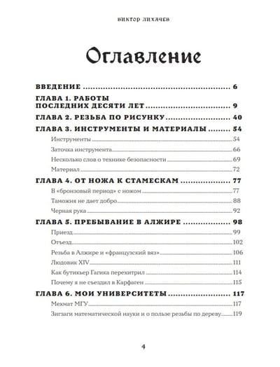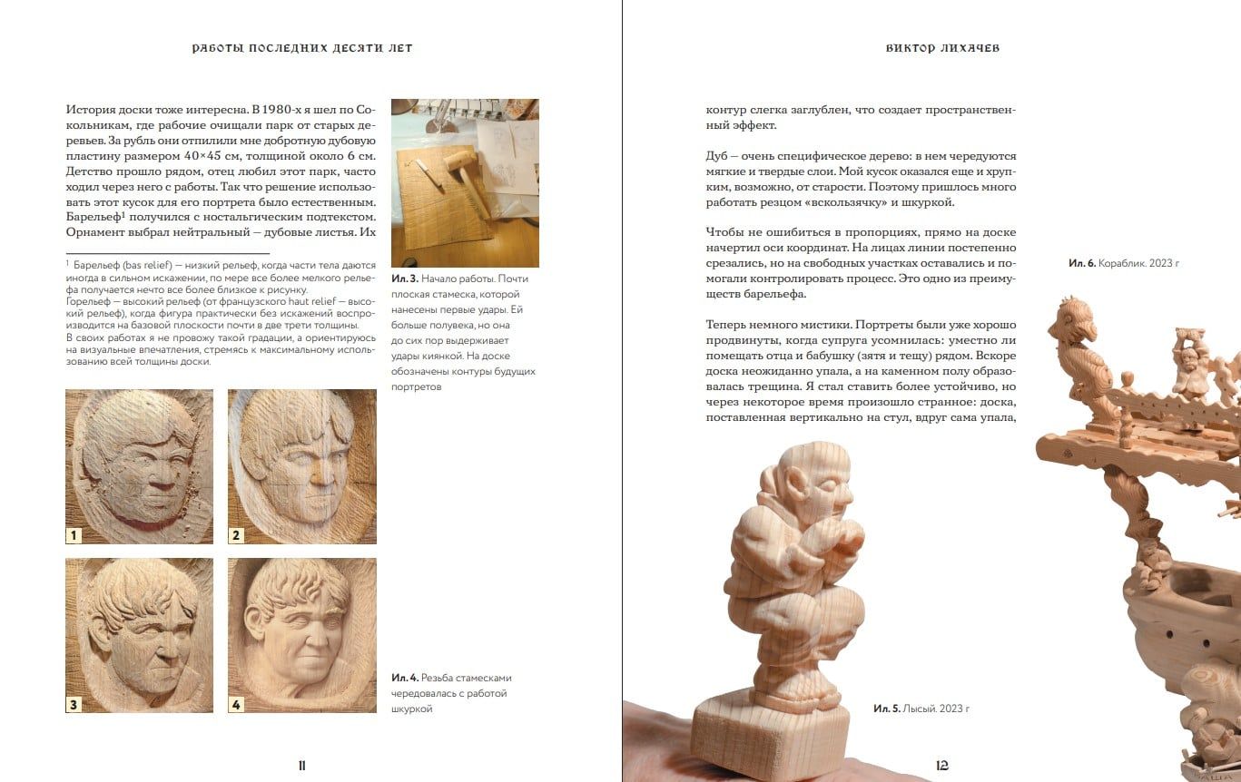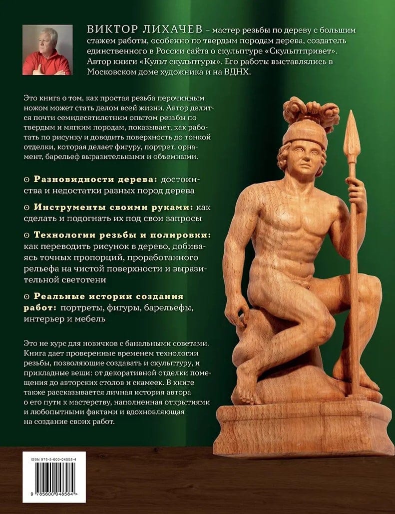 Šī Viktora Lihačeva, meistara ar septiņdesmit gadu kokgriezuma pieredzi, grāmata ir vairāk nekā tikai tehnisks ceļvedis. Tā ir cilvēka atzīšanās, kurš savu dzīvi ir veltījis koka pārveidošanai mākslā. Viņš dalās savā pieredzē, grebjot cietu un mīkstu koku, demonstrējot, kā sekot dizainam un pilnveidot virsmu līdz smalkai apdarei, kas piešķir izteiksmīgumu un apjomu figūrām, portretiem, ornamentiem un bareljefiem. Grāmata piedāvā laika gaitā pārbaudītas kokgriezuma tehnikas gan skulptūru, gan lietišķās mākslas radīšanai: no dekoratīvas interjera apdares līdz individuāliem galdiem un soliem. Grāmatā ir arī autora personīgais stāsts par viņa ceļu uz meistarību, kas ir pilns ar atklājumiem un interesantiem faktiem, iedvesmojot viņa paša darbu radīšanu.