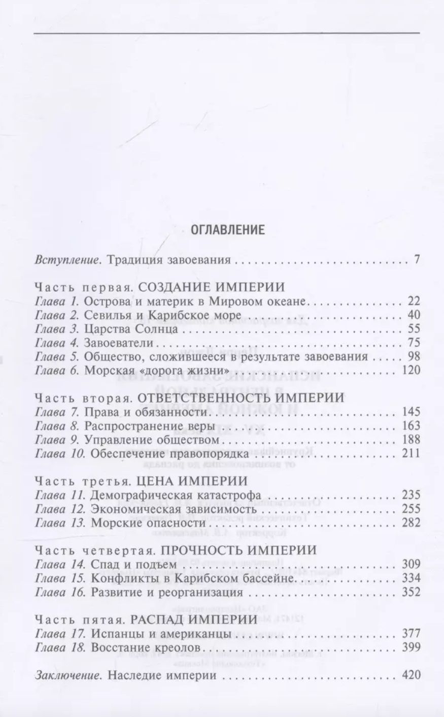 Izcilais britu vēsturnieks Džons Perijs stāsta par lielās jūras Spānijas lielvalsts uzplaukumu, uzplaukumu un sabrukumu. Autors izseko Spānijas ietekmei Centrālamerikā un Dienvidamerikā, sniedzot plašu, spilgtu priekšstatu par tās iekarošanas procesu, ekonomiskajām un sociālajām sekām Spānijai un tās centieniem saglabāt kontroli pār šīm plašajām valdām. Perijs pēta impērijas sarežģīto pārvaldi, tās ekonomiku, sociālo struktūru, Baznīcas lomu, iekarotajās teritorijās valdošo kultūru iznīcināšanu un to panīkuma ietekmi uz Spānijas politiku. Džona Perija klasiskais pētījums iezīmēja jaunu dimensiju bijušo Spānijas koloniju Latīņamerikā vēstures pētniecībā un pirmskolumbu kultūras pārveidošanā par koloniālām valstīm.