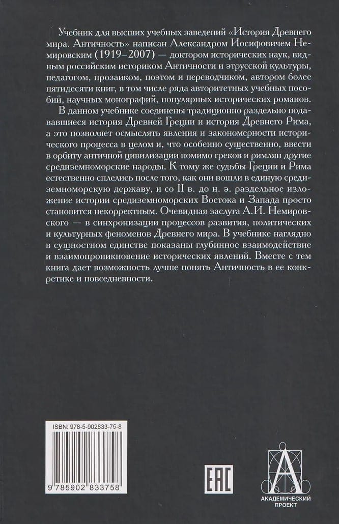 Mācību grāmatu augstākās izglītības iestādēm "Senās pasaules vēsture. Antīkums" sarakstījis Aleksandrs Iosifovičs Ņemirovskis (1919–2007), vēstures zinātņu doktors, ievērojams krievu klasiskās senatnes un etrusku kultūras vēsturnieks, skolotājs, romānists, dzejnieks un tulkotājs, kā arī vairāk nekā piecdesmit grāmatu autors, tostarp vairāku autoritatīvu mācību grāmatu, zinātnisku monogrāfiju un populāru vēsturisku romānu.